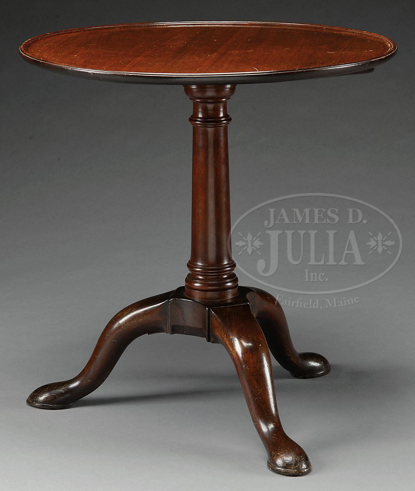 One leg restored at base. GEORGE III MAHOGANY TILT TOP TEA TABLE. Second half 18th century, England. The circular top with dish rim hinged and tilting on a ring-turned cannon barrel shaft raised on a tripod base with arched carved legs terminating in oversized pad feet. SIZE: 26″ dia x 27″ h. CONDITION: Very good, old if not original finish. 9-92146 (500-800)