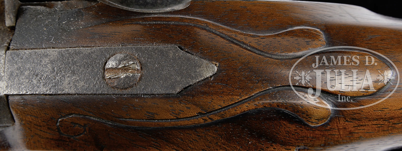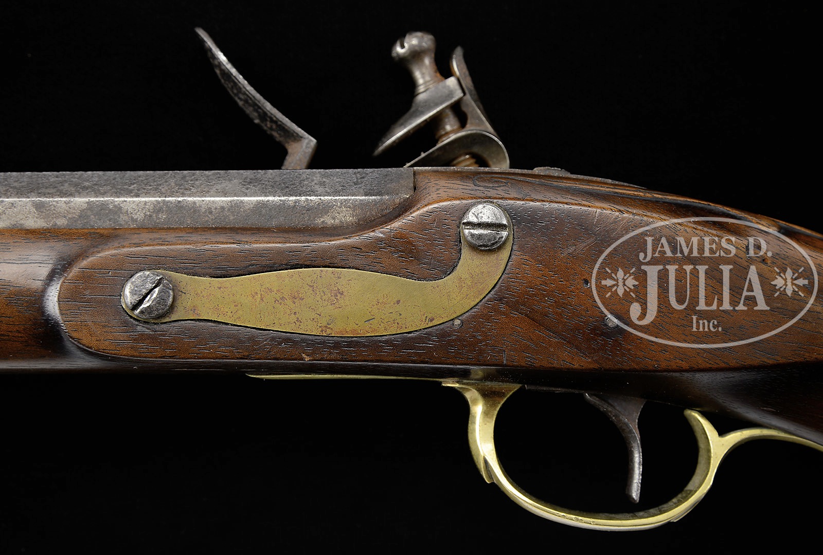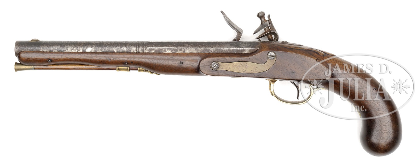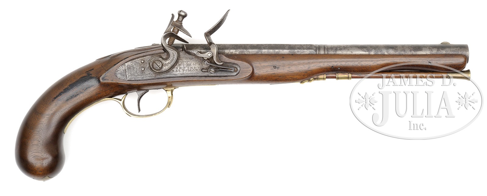 LATE RELIEF CARVED FLINTLOCK KENTUCKY PISTOL MARKED MCKIM AND BROTHERS, BALTIMORE.SN NSN. 10″ oct to rnd 50 Cal. smooth unmarked bbl. Overall 16-1/2″. Walnut stock is relief carved around bbl tang. 5 pointed brass star inlay on bottom of butt. Brass sideplate is military in style and brass furniture has no engraving. Engraved flintlock is marked “McKim & Brothers, Baltimore”. William D. McKim is recorded in Baltimore as McKim & Bro. circa 1834-1841 and was an importer and hardware dealer. PROVENANCE: Frank Sujansky Collection. CONDITION: Excellent. 4-49483 RG32 (3,000-6,000) – Lot 2395