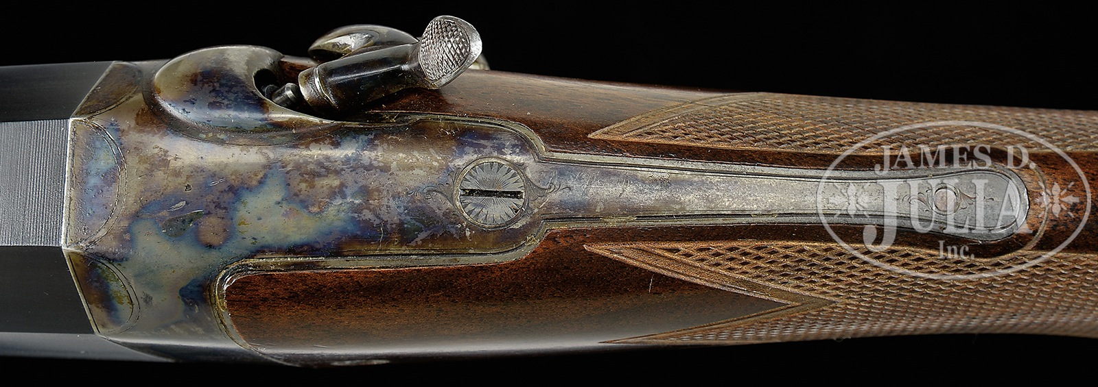 ARMY & NAVY SINGLE SHOT JONES UNDERLEVER FOUR BORE SHOTGUN WITH NEW RIFLE BARREL BY J. J. PERODEAU.SN 13356. (ca 1892) Cal. 4 Bore. Original 36″ smooth bore bbl is engraved “Army & Navy C. S. L. London” on top flat of 4″ octagonal breech section, which transitions to round and tapers to muzzle. Bbl flats are stamped with Birmingham proofs for 4 bore chamber. Bbl has considerable choke, and is fitted with its own dedicated forend with horn tip and spring tension release. 28-3/4″ Mono-bloc rifle bbl is fitted with broad file cut full length rib mounted with one standing leaf express rear sight, and silver front bead longitudinally dovetailed into slightly raised front portion of rib. Bbl flat is engraved “J. J. Perodeau Gunmaker” “Enid OK”. A sling eye in large rectangular base is soldered to bottom of bbl. Case hardened Jones underlever action is fitted with peninsula rebounding back lock with round bodied serpentine hammer. Action has some line border engraving. Lockplate is engraved “Army & Navy C.S.L.” Steel trigger guard has SN on tang which extends to large steel grip cap. Lightly figured European walnut capped pistol grip buttstock measures 14-1/2″ over Silver type pad with spur, and features shadow line right hand cheekpiece, flat top point pattern checkering with mullered borders, and a sling eye on toe line. Stock is newly made, and matching large forend has ebony tip and forward pivoting lever release. Rifle bbl: Drop at heel: approx 2-7/8″, drop at comb: approx 2-3/16″. Weight: 19 lbs. 8 oz. LOP: 14-1/2″. Accompanied by 8 modern brass casings w/ modern bullet mould and RCBS handle. CONDITION: Excellent, as partially refurbished. Orig shotgun bbl retains over 80% of its orig blue, with some marks, scratches, spotting, and high edge wear. Forend retains most of its orig finish. Newly made rifle bbl retains essentially all of its blue. Action and lock retain over 90% of their orig case hardening color. Newly made buttstock and forend retain nearly all of their finish with some light scratches. All bores are excellent. Action is tight. Bbls are on face. Lock is crisp. 50227-1 MGM266 (8,000-12,000) – Lot 2396