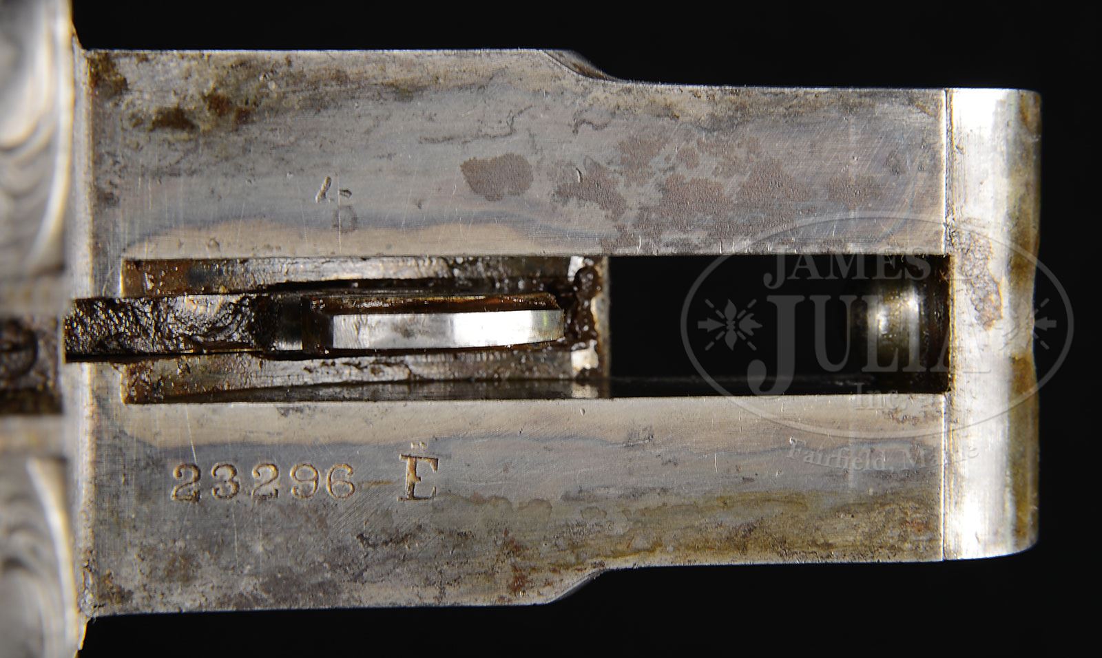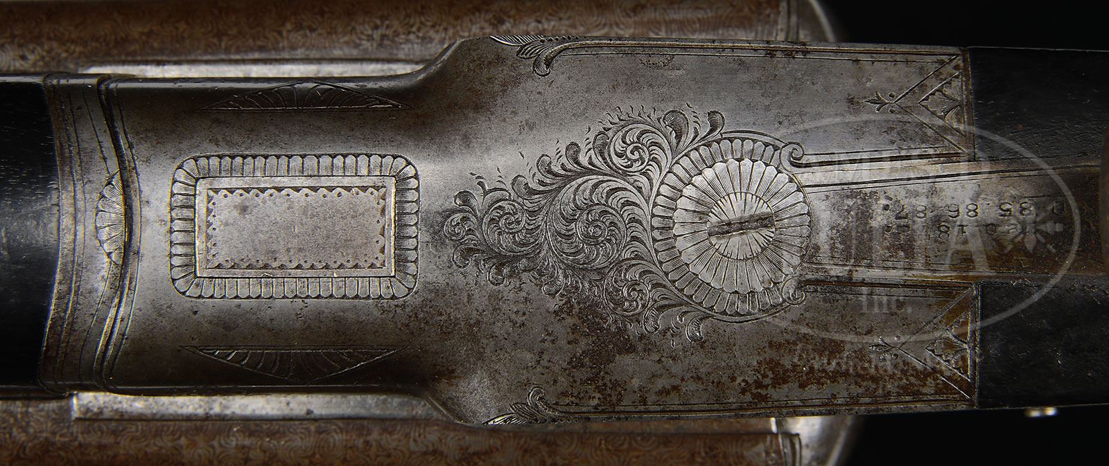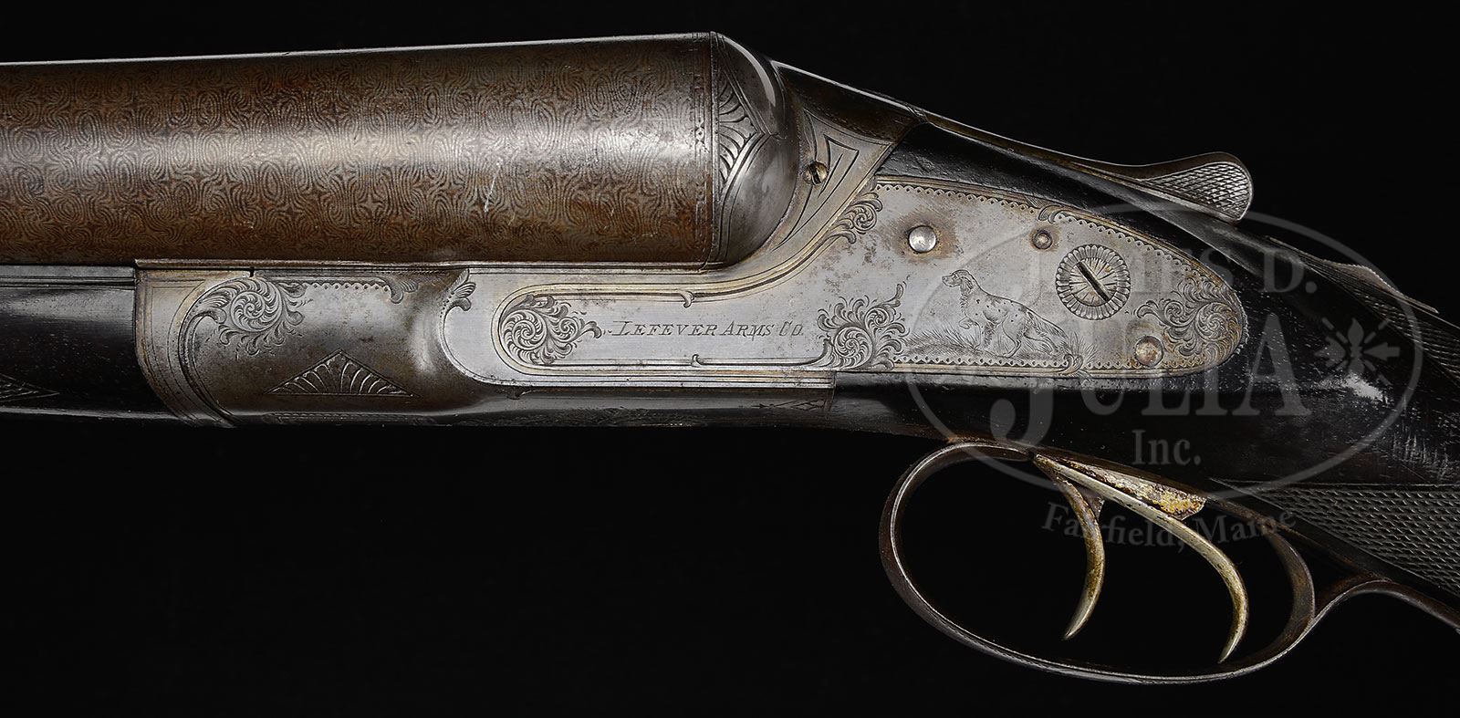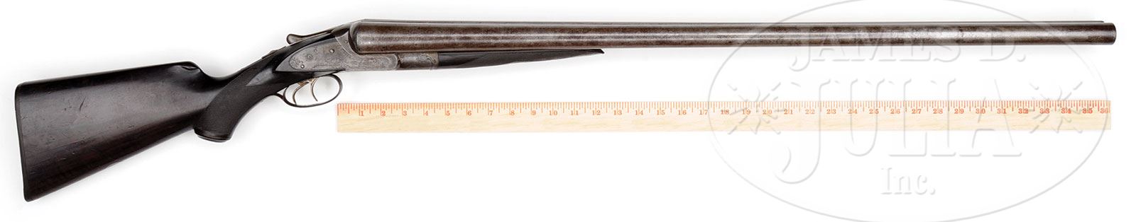 SN 23296. Cal. 8 ga. Approx 3-1/4″ Chambers. 34″ Damascus bbls with flat, matted top rib are engraved “DAMASCUS” and “STEEL” on tops. SN is on bottom of left bbl. Water table is stamped with SN and “E”. Lefever sideplated action has late style cocking hook and features automatic safety, cocking indicators, and double triggers. Action and lockplates are engraved in early “E” style with 30% coverage of well cut scroll, and exceptionally well detailed renditions of pointing dogs on lockplates; a setter on left, and a pointer on right. A spaniel with retrieved duck is on trigger guard bow. SN is at grip. “Lefever Arms Co” is on each lockplate. Patent dates are stamped on trigger plate, the latest being ’87. Dense, dark, streaked and lightly figured European walnut capped pistol grip buttstock measures 13-5/8″ over ribbed horn buttplate. Point pattern checkering is at grip, and a vacant silver oval is on toe line. Matching splinter forend has dogs-head central medallion. Bore diameter: left -.950, right -940. Bore restrictions: left -.115 (full), right -.130 (full). Wall thickness: left -.085, right -.087. Drop at heel: 2-7/8″, drop at comb: 1-7/8″. Weight: 15 lbs 5 oz. LOP: 13-5/8″. PROVENANCE: Estate Collection of Lewis & Leyton Yearout. CONDITION: Very good to fine, essentially “as found”. Bbls retain a considerable amount of orig Damascus finish, but are mostly silvered and browned. Action and lockplates retain a considerable amount of orig case hardening color with spots of rust. Stocks retain most of their orig finish with a number of marks and dings. A sliver (1″ x 3/8″) has detached from right front portion of forend, and has been pinned back, many years ago. Bores are somewhat pitted. Action is tight. This gun would greatly profit from a judicious cleaning. An exceptional, untouched example of a very high grade American waterfowler. 4-53905 MGM50 (6,000-10,000) – Lot 2397