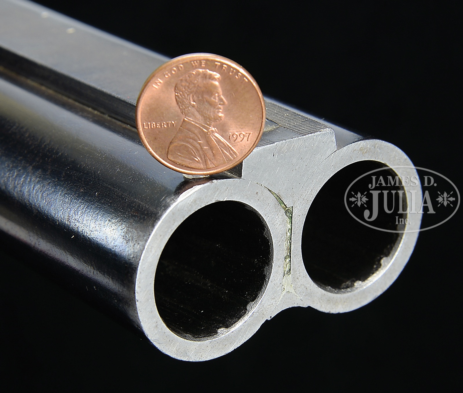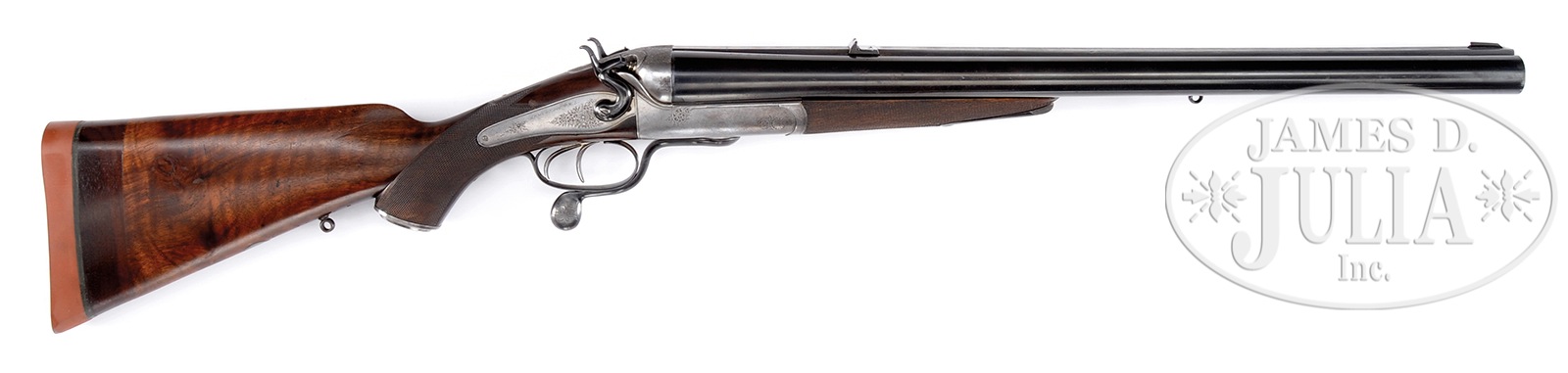 8 BORE ARMY & NAVY REBOUNDING HAMMER DANGEROUS GAME RIFLE.SN 13079. Cal. 8 Bore. 3-1/2″ Chambers. 24″ Dovetailed steel bbls are fitted with broad, full length, matted rib with dolls head extension. Bbls are sighted with one standing, one folding leaf express rear with platinum lines marked for 50 and 100 yards. Silver bead front is longitudinally dovetailed into slightly raised portion at muzzle end. Tops of bbls are engraved with makers name and address. Bbl flats are stamped with London black powder proofs. Round bodied, Jones underlever action is fitted with rebounding back locks with round bodied serpentine hammers. Action and locks are engraved with sprays of extremely well cut, large, open shaded scroll. Top of action is stippled. Makers name is on each lockplate. SN is on trigger guard tang, which extends to steel grip cap. Nicely fiddle figured and lightly streaked European walnut capped pistol grip buttstock measures 15-1/4″ over Silver type pad over 1-1/4″ walnut extension. Stock features shadow line right hand cheekpiece, typical point pattern checkering at grip, and a sling eye, as well as a vacant silver oval, on toe line. This area is also stamped with Kenyan (?) registration number “1066” behind grip cap. Matching splinter forend has forward pivoting lever release. Drop at heel: approx 2-9/16″, drop at comb: approx 2″. Weight: 17 lbs. 2 oz. LOP: 15-1/4″. Accompanied by 2 modern bullet moulds and RCBS handle. CONDITION: Very good. Bbls retain over 90% of an old re-black over scattered light pitting, marks, and scratches, with a few subsequent marks, and some thinning and browning on sides. Engraving is somewhat washed. Action has been cleaned to an overall silver gray with some subsequent darkening. Stocks retain most of an old oil finish with numerous marks and scratches. Checkering has been refreshed. Lengthening piece and pad are relatively new. Bores are very fine, shiny, with strong rifling throughout, with scattered pitting, mostly in right bbl, with a few flecks in left. Action is tight. Bbls are on face. Locks are excellent. This rifle balances well, and would probably be a great shooter. 50227-3 MGM267 (15,000-25,000) – Lot 2397