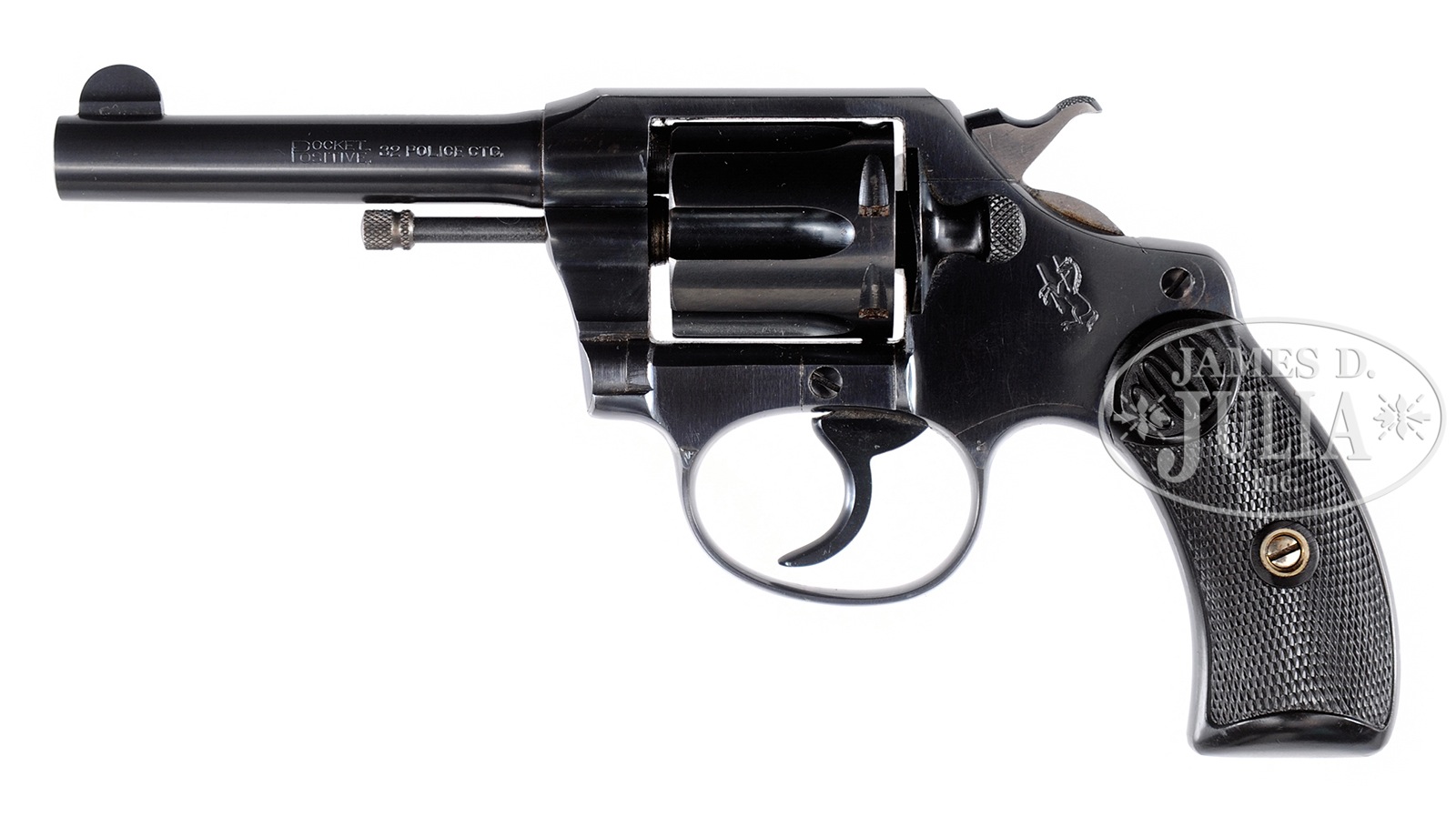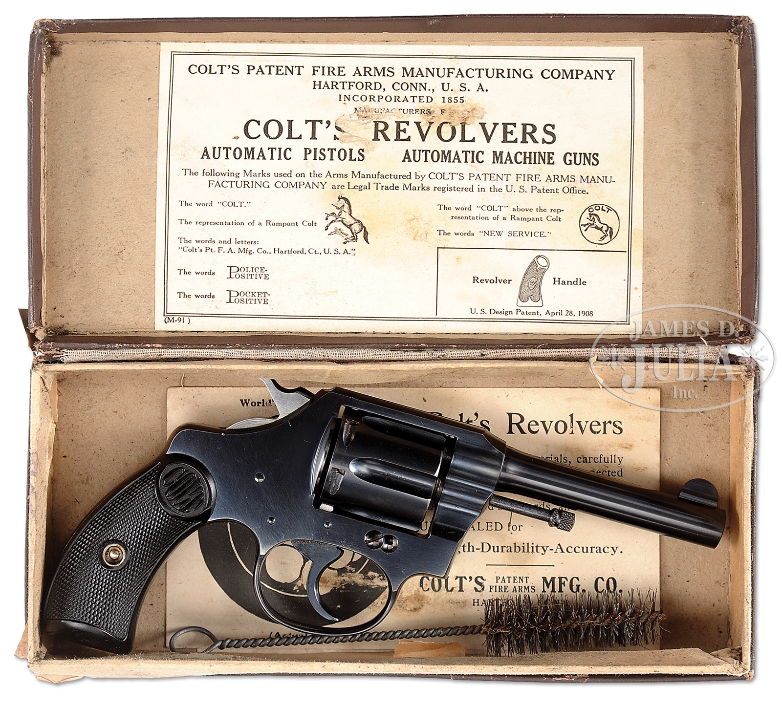*COLT POCKET POSITIVE WITH BOX.SN 95082. Cal. 32 Police. 3-1/2″ bbl. Blue finish with Colt hard rubber grips. Accompanied with SN matching Colt box with label. Manufactured 1920. PROVENANCE: The Charles Copeland, Jr. Collection. CONDITION: Exceptionally fine overall with only the slightest trace of handling. Bore and mechanics are as new. Box and label are very fine with slight distress to exterior, but are present and and solid. 50823-28 TDW (1,000-1,500) C&R – Lot 2397
