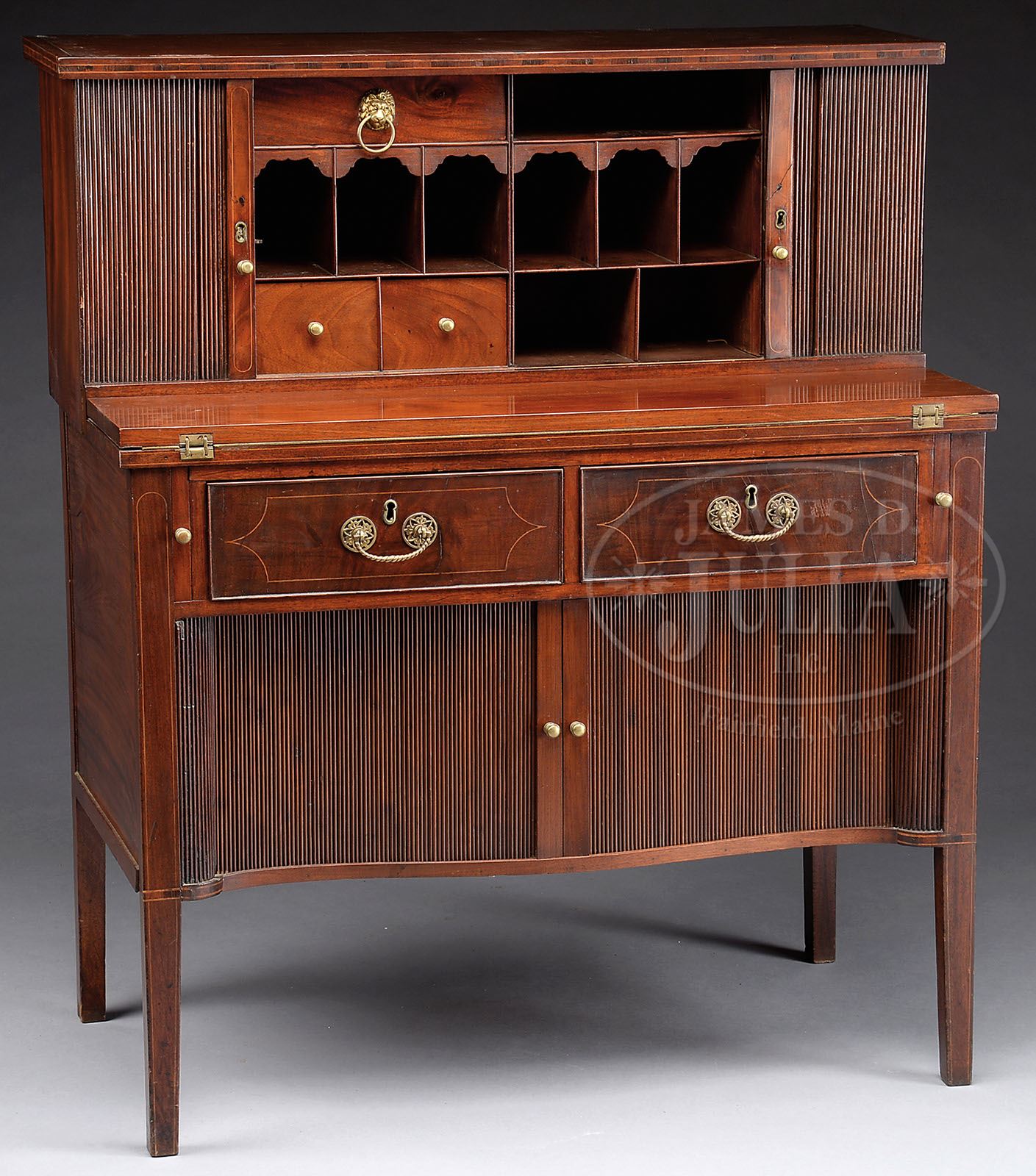 DIMINUTIVE FEDERAL MAHOGANY TAMBOUR DESK. Early 19th century. In two parts, the rectangular upper section with tambour slides flanked by simulated tambours opening to an interior fitted with an arrangement of drawers and valanced pigeon holes fitted to and set back upon the conforming lower case with hinged lid opening to a baise lined writing surface supported by lopers centering a pair of aligned thumb-molded short drawers above a pair of serpentine tambour slides flanked by demilune simulated tambours, the case raised on square tapering legs with string inlay outlines. SIZE: 45″ h x 38″ w x 20-1/2″ d. CONDITION: Desk retains original surfaces with overall minor cosmetic veneer repairs. Brass hardware appear to be later period replacements. An old repair above lockplate on proper left tambour door upper section. Otherwise good. 9-90184 (2,000-4,000)
