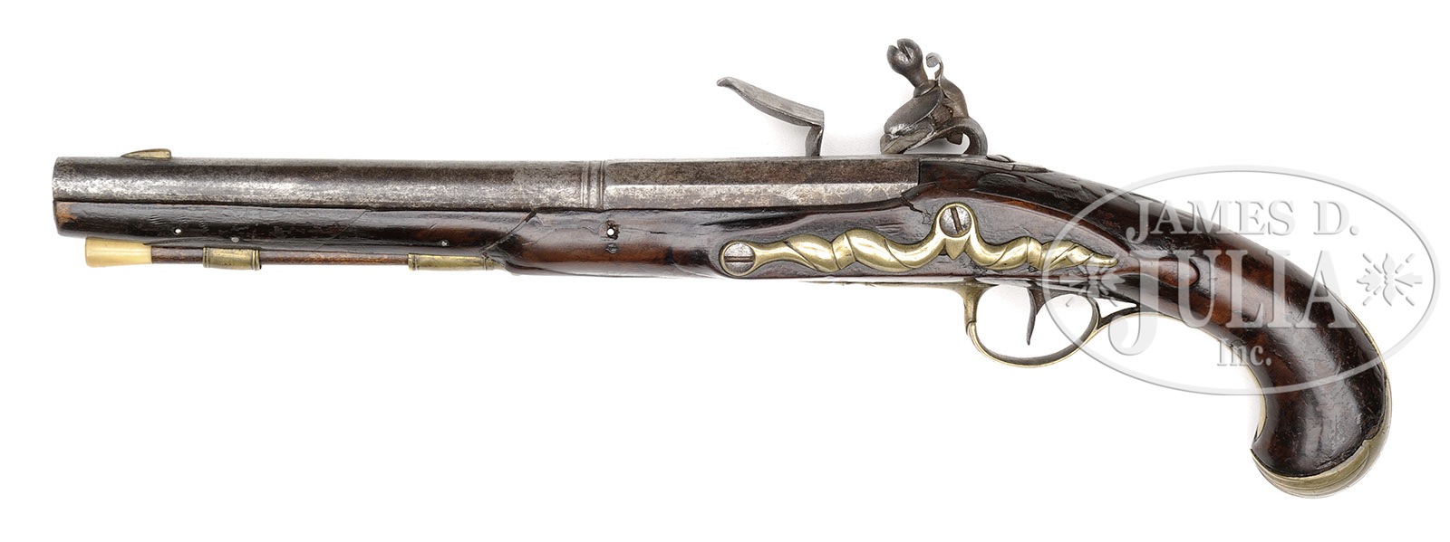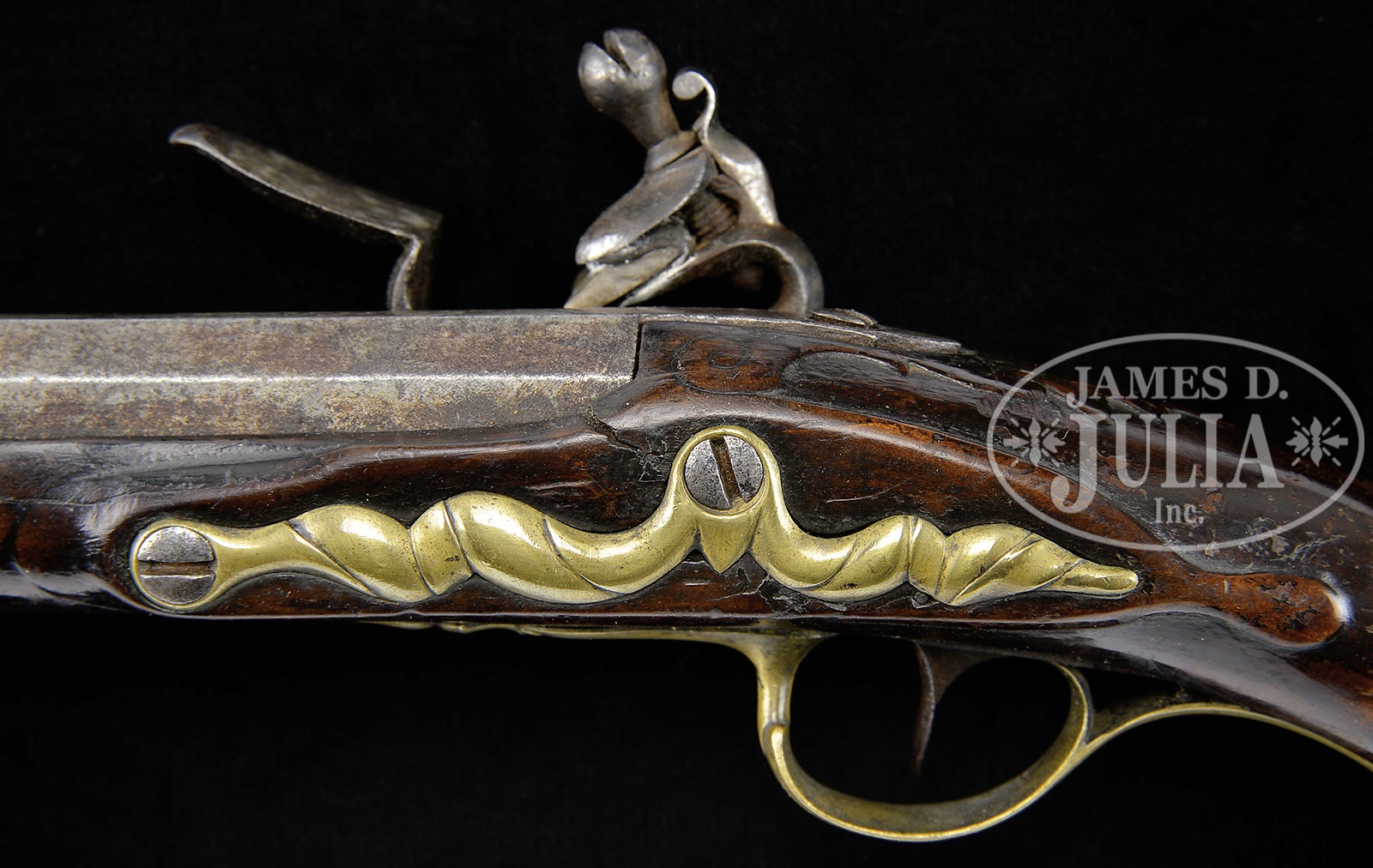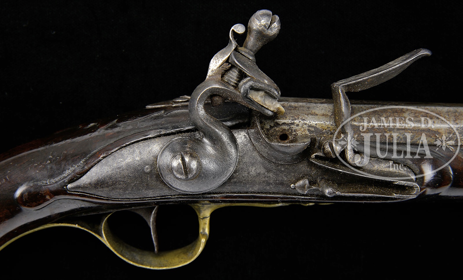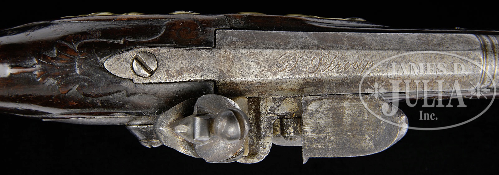 WALNUT STOCKED FLINTLOCK RELIEF CARVED KENTUCKY PISTOL SIGNED D. STROUP SOLDIER AND GUNMAKER OF THE CONTINENTAL ARMY.SN NSN. 9-3/4″ oct to rnd 58 Cal. smooth bbl signed in script “D. Stroup”. Overall 15-1/4″. Walnut stock is relief carved around bbl tang with relief beaver tails to rear of lock and sideplate. Brass furniture is early in style. 4-1/2″ heavy brass serpentine sideplate is unique. Nicely fluted brass buttcap is not engraved. “Andrew” is lightly scratched into buttcap. Convex flintlock plate is unmarked. This very pistol is pictured on p. 237 of The Kentucky Rifle Associations 1976 book, Kentucky Rifles & Pistols 1750-1850 while in the collection of Tom Seymour. According to information researched by Red Jackson of Jackson Arms in 1965, David Stroup was both a soldier and a gunmaker of the Continental Army in Pennsylvania. After the revolution, he moved to North Carolina where he erected an iron works in Lincoln County, N.C. PROVENANCE: Ex Tom Seymour Collection. Frank Sujansky Collection. CONDITION: Average. First 3″ of forend wood replaced. Cracks on right and left side over rear ramrod pipe. 4-49477 RG31 (2,000-3,000) – Lot 2401