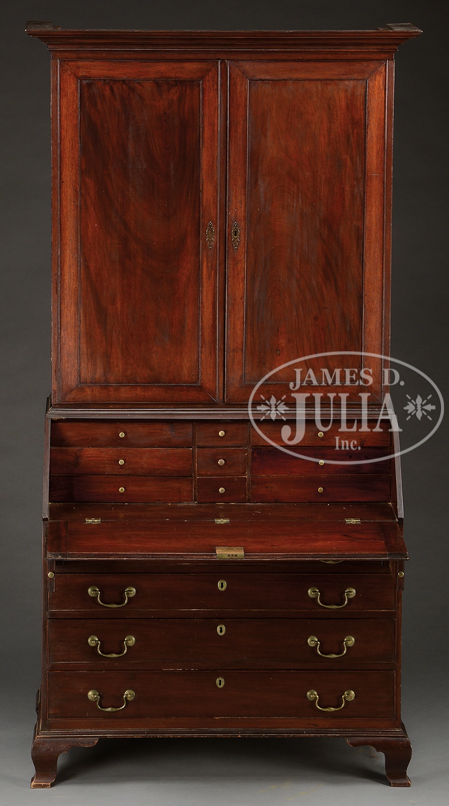 CHIPPENDALE FIGURED MAHOGANY SECRETARY BOOKCASE.Last-quarter 18th century, Vermont. The secretary in two parts. The bookcase having a bold complex overhanging cornice, and highly figured flat panel doors fitted with three adjustable shelves. The desk having a hinged slant lid, revealing a fitted interior consisting of nine drawers, above four graduated cock-beaded full-width drawers, having a complex base molding and bold ogee carved feet. Cherrywood and northern white pine secondary woods. Case retains mostly original brass hardware. NOTE: The dovetails, joinery and highly refined feet suggest a Rhode Island influence from the Goddard Townsend School: possibly the work of a Townsend family member or trained cabinetmaker relocated to Vermont. SIZE: 86″ h x 41-1/2″ case w x 22″ d. CONDITION: Very good original condition with old maintained surface. Old repair to cleat lip of lid, proper right side. Some replacements to cock-beading. Age cracks to both sides of lower case, minor shrinkage crack to lid, minor cracks to feet. Two interior shelves old replacements. 50839-1 (3,000-5,000) – Lot 2401