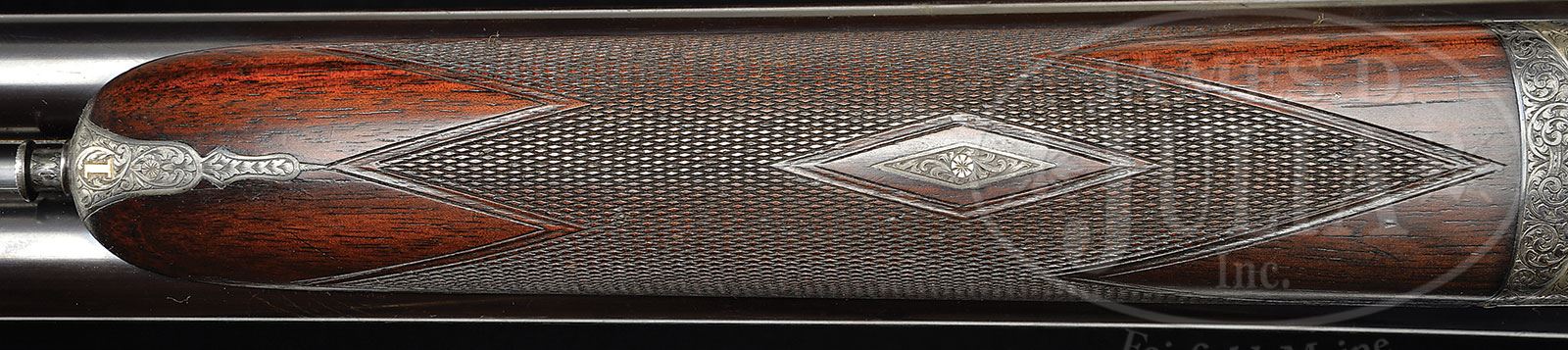 *CASED PAIR OF HOLLAND & HOLLAND ROYAL BREVIS GAME GUNS WITH CARTRIDGE MAGAZINE.SN 30970/ 30971. (ca 1926) Cal. 12 ga. 2-1/2″ Chambers. These guns have 25″ chopper lump bbls; undoubtedly inspired by the large following attained by Robert Churchill and his XXV gun. (These short barreled guns were not dubbed “Royal Brevis” until after 1931, when all Holland Royals with bbls 28″ or less were referred to by this name.) The bbls of this matched pair, with nos “1” and “2” gold inlaid on rear of ribs, top levers, and forend tips, are engraved “Holland & Holland.” and “98 New Bond Street, London” on tops of each bbl set. Bbl flats are stamped with London nitro proofs for 2-1/2″ chambers, and bbls are fitted with 1922 patent self-opening assist spring. Typical H & H Royal actions are stocked to the fences and feature automatic safeties (SAFE inlaid in gold), gold band tumbler end cocking indicators, double triggers, and H & H patent hand detachable locks. Actions and lockplates are engraved with classic H & H house style large, shaded, open scroll with acanthus highlights. “Holland & Holland” is in arched scroll flanked device at the center of each lockplate. Bottoms of actions are engraved “ROYAL” “SELF-OPENER” and “PATENT 1922”; top levers “ROYAL EJECTOR”. Lightly figured and nicely streaked European walnut straight grip buttstocks feature diamond hands, drop points, typical point pattern checkering with mullered borders, and gold ovals on toe lines. Gun no. “1” has oval engraved “F. S. C” and has unusual rubber faced foam rubber pad, while gun no. “2” has vacant oval and checkered wood butt. Matching splinter ejector forends have Anson releases. Gun no. “1”: Bore diameter: left-.732, right -.732. Bore restrictions: left -.006 (IC), right -.007 (IC). Wall thickness: left -.024, right -.028. Drop at heel: 2-1/16″, drop at comb: 1-3/8″. Weight: 6 lbs. 2 oz. LOP: 13-5/8″. Gun no. “2”: Bore diameter: left-.734, right -.734. Bore restrictions: left -.009 (IC), right -.003 (IC). Wall thickness: left -.022, right -.023. Drop at heel: 2-3/8″, drop at comb: 1-1/2″. Weight: 6 lbs. 5 oz. LOP: 13-9/16″. Original makers oak and leather two gun case with brass corners and push button lock, is embossed “F. S. C.” on top. Interior is lined in scarlet cloth with gold embossed H & H label in lid, along with charge card for these particular guns, and H & H notice regarding extractors. Case contains H & H marked round pewter oil bottle, two pairs of Holland marked snap caps, a bone striker case containing four strikers, marked “30770, 30771 spare strikers”, and a nickel-plated tweezer-type broken case extractor. Also included is an oak and leather 16″ x 12″ cartridge magazine with brass corners. Interior is lined in scarlet cloth, having Holland & Holland gold embossed black leather label, with five compartments for cartridges. PROVENANCE: Bureau of Customs Certificates of Registration. CONDITION: As found. Gun no. “1”: Excellent. Bbls retain 95% orig black, slightly thinned at normal carry area. Action and lockplates retain most of their muted orig case hardening color. Orig blue of top lever and trigger guard, is silvering at normal areas of wear. Pad is petrified. Stocks retain nearly all their orig finish with some minor marks and scratches from normal use. Bores are excellent, bright and shiny, but with areas of what appears to be spots of congealed oil, mostly on top of right bore. Action is tight. Bbls are on face. Ejectors are strong and in time. Gun no. “2”: Excellent, as refurbished. Bbls retain nearly all of an excellent quality re-black. Action and lockplates coin finished and starting to oxidize, mostly on bottom. Forend iron, top lever, and trigger guard re-blued, and retain nearly all of that blue. Buttstock is a new well done replacement. (Tag affixed to trigger guard states “restock exactly the same meas. wood to match no 1 gun”.) Stock retains nearly all of its orig finish, is considerably lighter in color than gun no. “1”, and checkering is sharp. Otherwise shaping and inletting is of factory quality. There are some patches of wax paper adhering to stock near butt. Forend retains its orig finish and has 1″ x 1/8″ piece missing from left front edge. Bores are excellent, smooth, bright, and shiny. Action is tight. Bbls are on face. Ejectors are slightly out of time. Case leather is still light in color with some areas of rubbing and scratches. Straps and handle are good. Interior cloth has some minor insect damage and numerous rubs (some rubbed through) and some soiling. Partitions have been moved and are loose, with some pieces of blocking separated. Accessories are fine. Cartridge magazine leather has darkened, and has some rubs. Straps and handle are good. Interior cloth has considerable insect damage and mildew. 4-49586, 49588 (25,000-35,000) – Lot 2402