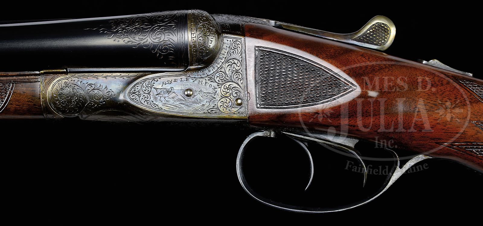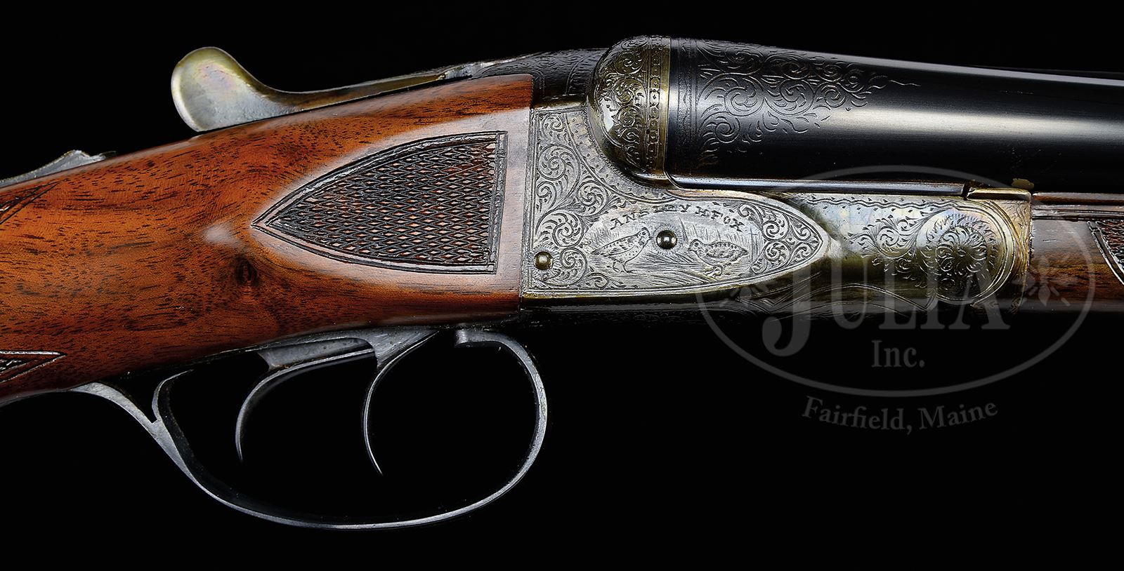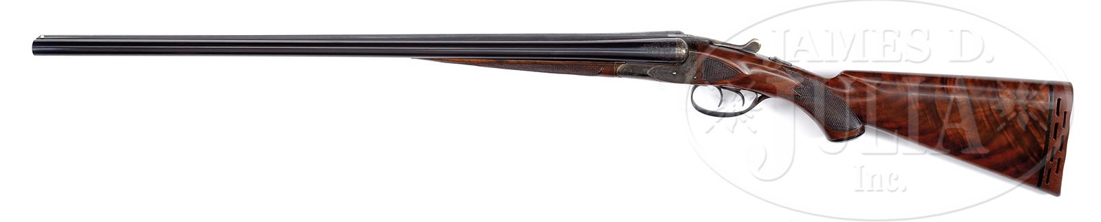 *DESIRABLE 20 GAUGE A. H. FOX CE GRADE.SN 203546. Cal. 20 GA 2-3/4” Chambers. 26” Chromox bbls with slightly raised, matted, concave rib are engraved with steel info and A. H. Fox Philadelphia address on tops. Breech ends have 1-1/2” triangles of simple scroll engraving. Bbl flats are stamped with SN, grade, and Savage proof. Small frame Fox case hardened action features automatic safety and dbl triggers. Action is engraved in standard “C” pattern with 50 – 60% coverage scroll, surrounding game scenes on sides; a pair of snipe on left, and quail on right. “ANSLEY H. FOX” is above each scene. Bottom of action portrays a setter within a circle. Blued trigger guard has vacant scrolled riband on bow, and SN at grip. Dense, finely stump figured American walnut capped pistol grip buttstock measures 13-7/8” over open sided Jostam pad. Side panels and grip are checkered, and have sgl line borders. Matching slim splinter ejector forend has small inlet ebony tip, and Deeley type release. Bore diameter: left -.616, right -.617. Bore restrictions: left -.016 (mod), right -.006 (IC). Wall thickness: left -.031, right -.027. Drop at heel: 2-1/8″, drop at comb: 1-9/16″. Weight: 6 lbs 4 oz. LOP: 13-7/8″. Special Note: This item contains or is made of ivory. Do not bid on this lot unless you have read and agreed to our "Ivory Position Statement" and the "Waiver of Legal and Financial Risk to James D. Julia in regards to your Purchase of an Ivory Object." This information is located in the front section of our catalog. CONDITION: Excellent, as completely refinished. Bbls retain essentially all of a glossy re-black, lettering picked up, engraving slightly softened. Action retains nearly all of a well colored re-hardening, again engraving slightly soft. Stocks have a few light marks in their hand rubbed oil finish, sharp edges a bit rounded. Checkering on forend cleaned up. Checkering on butt somewhat worn. Bores are excellent, with just a hint of frosting. Action is tight. Ejectors are in time. A fine usable 20 bore. Michael McIntosh estimates a total 413 were made in this grade. “Certifiable pre-ban ivory” bead sight. 49417-3 MGM218 IVORY (4,000-6,000) – Lot 2402