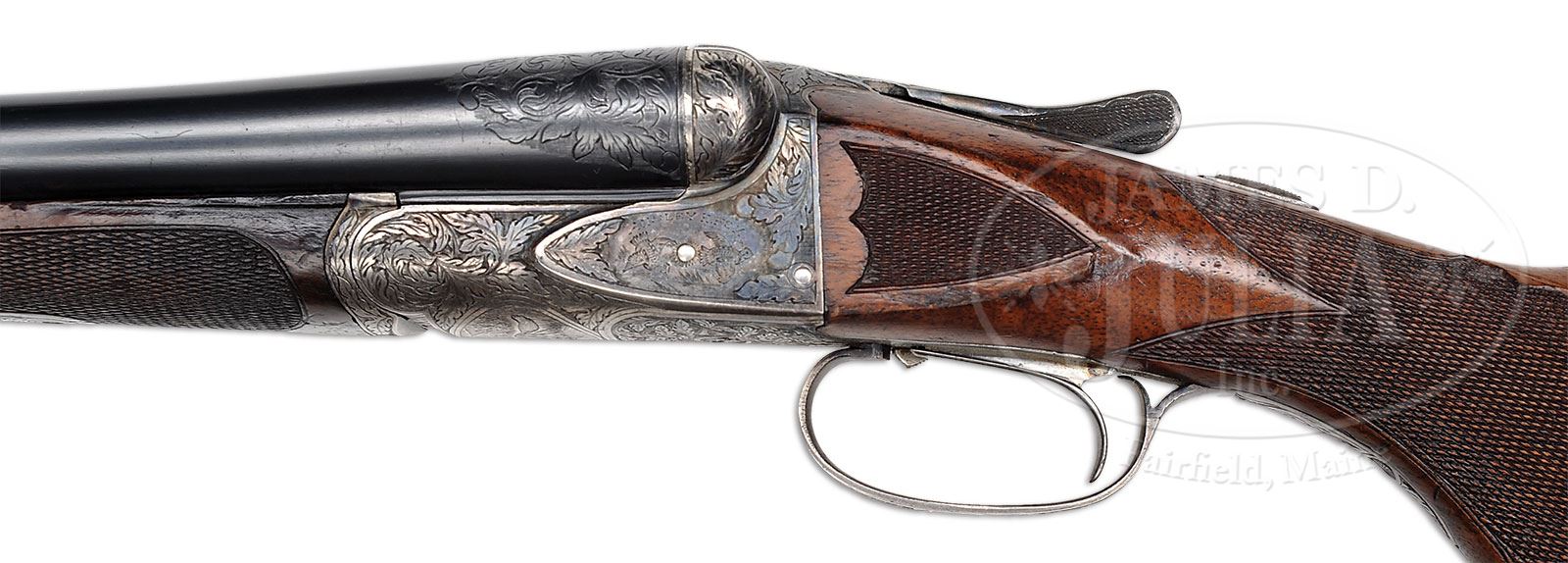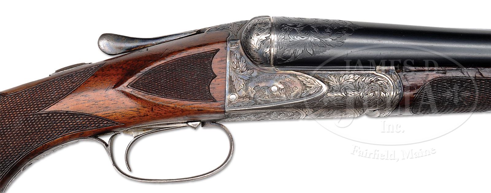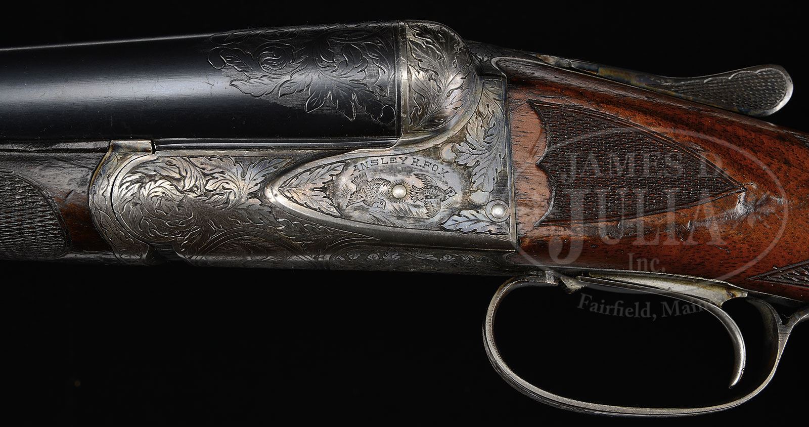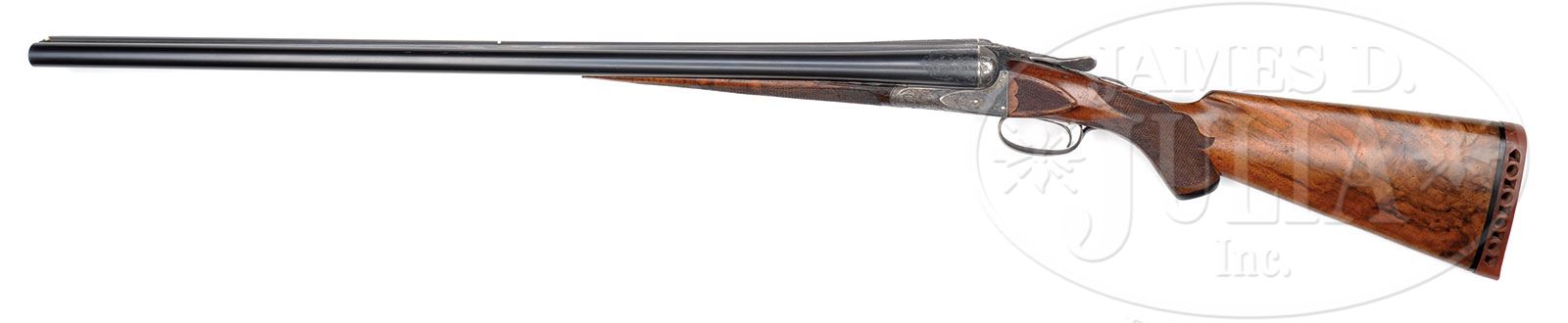 *PHILADELPHIA A. H. FOX XE 12 GA “THE TRAP GUN”.SN 25832. Cal. 12 ga. 2-5/8″ Chambers. 30″ Bbls with narrow, matted rib, are marked “CHROMOX FLUID COMPRESSED STEEL” and “MADE BY A.H. FOX GUN Co. PHILA. PA. U.S.A.” on tops. Breech ends are engraved with 2″ flourishes of large open shaded scrolled acanthus. Bbl flats are stamped with SN, grade, and Fox proof. Outer edges of flats and cocking slide, are damascened. Case hardened action with rebated back features automatic safety and Kautzky single selective trigger in rear position. Action is engraved in typical second generation “X” style with large shaded stylized oak leaves and acorns surrounding oval vignettes of flying quail on each side under “ANSLEY H. FOX”. Bottom of action depicts a fox in mountainous background. Well marbled and nicely figured European walnut capped pistol grip buttstock measures 14-1/8″ over open sided red “Ranger” pad. Side panels are checkered and checkering at grip is in semi-fancy backed modified point pattern. Attenuated splinter ejector forend has inset ebony tip and Deeley type release. Bore diameter: left-.728, right -.729. Bore restrictions: left -.039 (full), right -.042 (full). Minimum wall thickness: left -.035, right -.025. Drop at heel: 2-5/8″, drop at comb: 1-1/2″. Weight: 7 lbs. 6 oz. LOP: 14-1/8″. PROVENANCE: Estate Collection of Lewis & Leyton Yearout. Fox letter from Fox historian, Roe S. Clark confirming specifications and stating it was delivered Oct 12, 1923. CONDITION: Excellent, retaining a high percentage of orig finish on wood and metal, bbls over 85% blue, with a few minor marks and scratches, action over 90% vivid color, thinning and silvering on bottom and sharp edges, stocks most of their orig finish, grain somewhat raised, some finish loss due to installation of pad and new grip cap, which is marked “AYA EIBAR” (easily replaced). Checkering is slightly worn. Both stocks have a number of marks and scratches. Forend has considerable denting, with a tiny chip missing at right rear. There are some light chips behind action tang on buttstock. Bores are very fine, with some light frosting, and a couple of inconsequential dents on bottom of left bbl. Action is tight. The right ejector is intermittent. Trigger works well. This fine old high grade Fox has been in storage a long time, and could undoubtedly use a good cleaning. 4-53903 MGM128 (7,500-12,500) – Lot 2403 Click here to view provenance