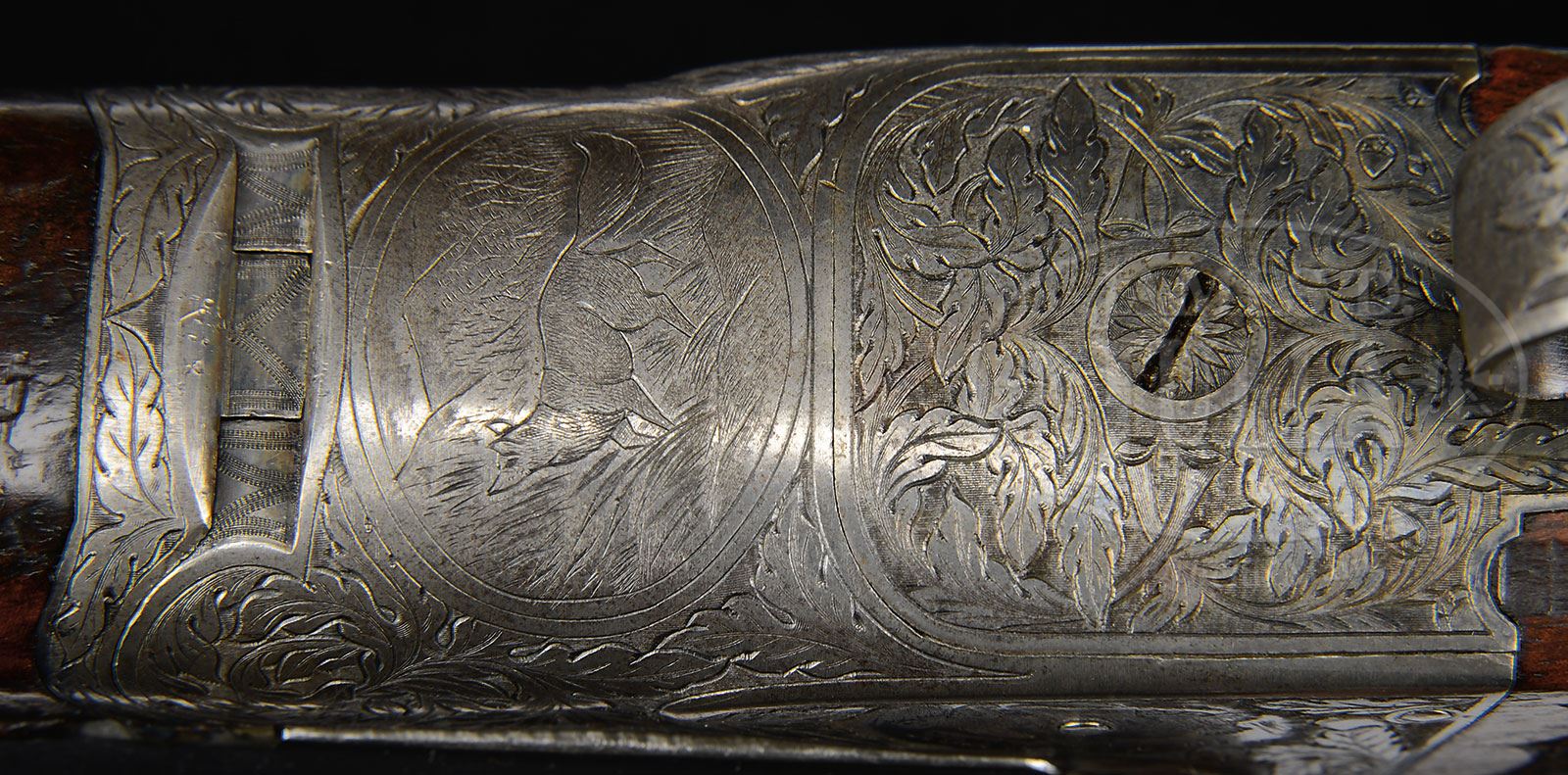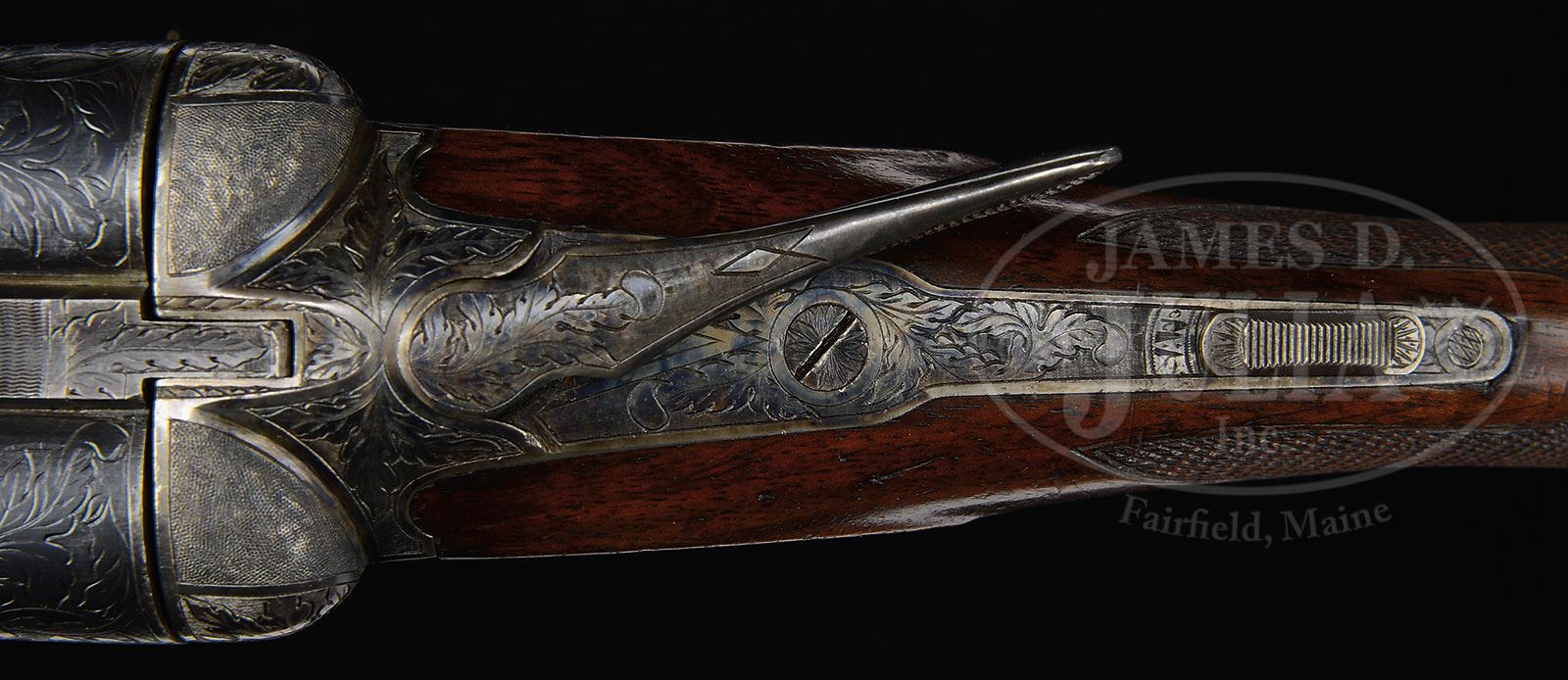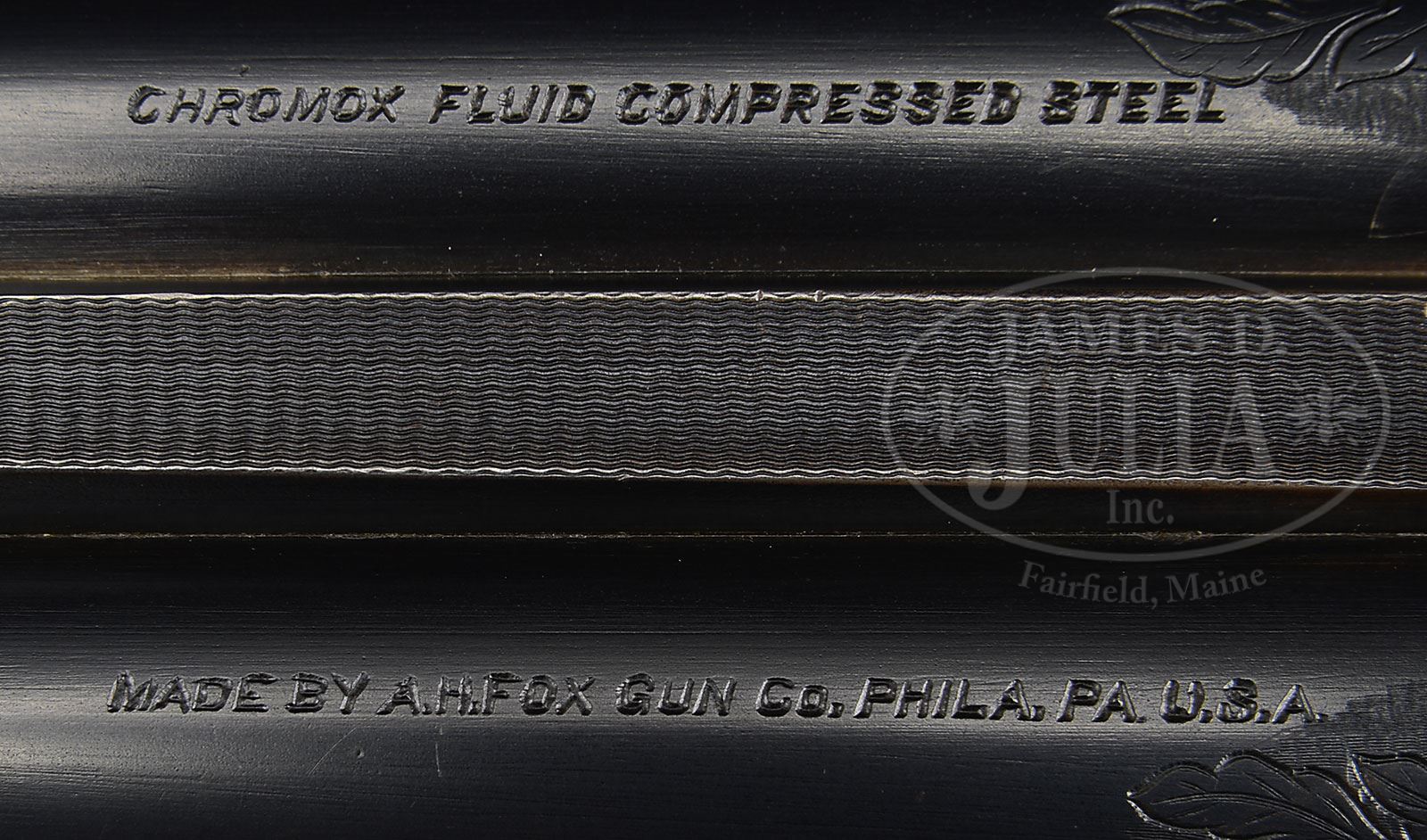 *PHILADELPHIA A. H. FOX XE 12 GA “THE TRAP GUN”.SN 25832. Cal. 12 ga. 2-5/8″ Chambers. 30″ Bbls with narrow, matted rib, are marked “CHROMOX FLUID COMPRESSED STEEL” and “MADE BY A.H. FOX GUN Co. PHILA. PA. U.S.A.” on tops. Breech ends are engraved with 2″ flourishes of large open shaded scrolled acanthus. Bbl flats are stamped with SN, grade, and Fox proof. Outer edges of flats and cocking slide, are damascened. Case hardened action with rebated back features automatic safety and Kautzky single selective trigger in rear position. Action is engraved in typical second generation “X” style with large shaded stylized oak leaves and acorns surrounding oval vignettes of flying quail on each side under “ANSLEY H. FOX”. Bottom of action depicts a fox in mountainous background. Well marbled and nicely figured European walnut capped pistol grip buttstock measures 14-1/8″ over open sided red “Ranger” pad. Side panels are checkered and checkering at grip is in semi-fancy backed modified point pattern. Attenuated splinter ejector forend has inset ebony tip and Deeley type release. Bore diameter: left-.728, right -.729. Bore restrictions: left -.039 (full), right -.042 (full). Minimum wall thickness: left -.035, right -.025. Drop at heel: 2-5/8″, drop at comb: 1-1/2″. Weight: 7 lbs. 6 oz. LOP: 14-1/8″. PROVENANCE: Estate Collection of Lewis & Leyton Yearout. Fox letter from Fox historian, Roe S. Clark confirming specifications and stating it was delivered Oct 12, 1923. CONDITION: Excellent, retaining a high percentage of orig finish on wood and metal, bbls over 85% blue, with a few minor marks and scratches, action over 90% vivid color, thinning and silvering on bottom and sharp edges, stocks most of their orig finish, grain somewhat raised, some finish loss due to installation of pad and new grip cap, which is marked “AYA EIBAR” (easily replaced). Checkering is slightly worn. Both stocks have a number of marks and scratches. Forend has considerable denting, with a tiny chip missing at right rear. There are some light chips behind action tang on buttstock. Bores are very fine, with some light frosting, and a couple of inconsequential dents on bottom of left bbl. Action is tight. The right ejector is intermittent. Trigger works well. This fine old high grade Fox has been in storage a long time, and could undoubtedly use a good cleaning. 4-53903 MGM128 (7,500-12,500) – Lot 2403 Click here to view provenance