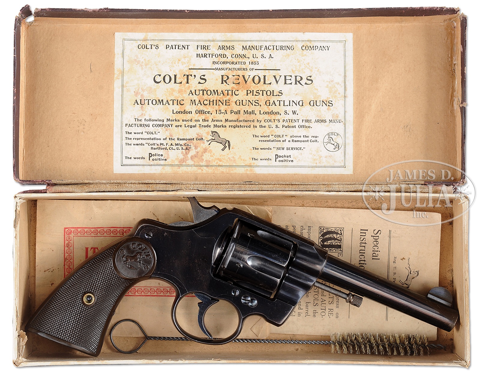 *SUPERB COLT NEW ARMY REVOLVER WITH BOX.SN 287654. Cal. 38 SPL. 4-1/2″ bbl. Early high polish blue with early rampant Colt hard rubber grips. With exceptional early blue label Colt shipping box and accessories. PROVENANCE: The Charles Copeland, Jr. Collection. CONDITION: Exceptional condition New Army with most early high polish blue remaining, slight finish loss on grip strap, and leading edges of muzzle. Has slight finish loss at flutes of cyl. Still retains most of bright peacock blue on trigger. Grips are exceptional with no cracks or material loss. Box is very fine with exceptional blue label, with correct first 3 digits of SN and last 3 indiscernible. Manufactured 1907. 50823-10 TDW (1,000-1,500) C&R – Lot 2405