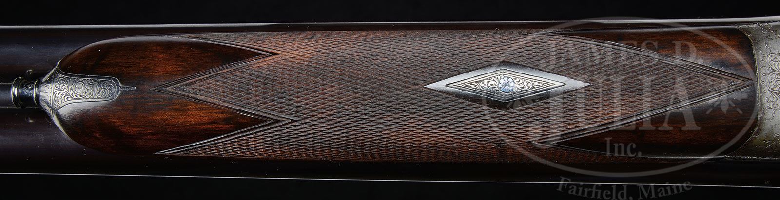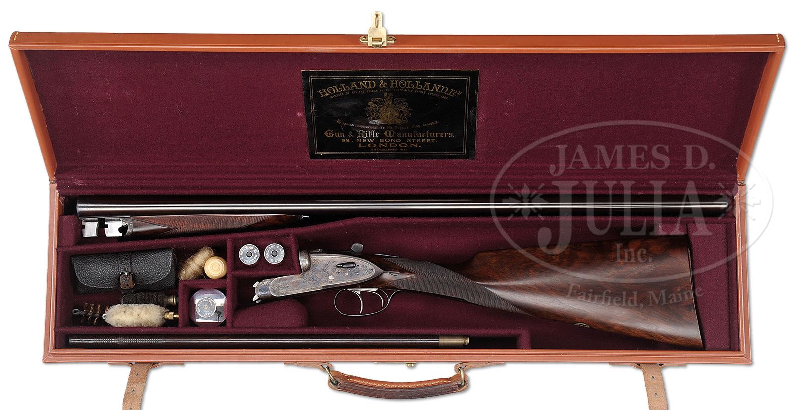 *RARE TWO INCH 12 GAUGE HOLLAND & HOLLAND (CENTENARY) BADMINTON GRADE SIDELOCK EJECTOR LIGHT GAME GUN WITH CASE.SN 32497. (1929) Cal. 12 ga. 2″ Chambers. 28″ Chopper lump bbls are engraved “FOR 2 INCH CASES ONLY” and “CENTENARY” (Holland’s proprietary name for the 2″ 12 bore, which originally was to be called the “Twelve-Two”) on narrow, swamped game rib. Tops of bbls are engraved with H&H name and New Bond Street address. Bbl flats are stamped with London nitro proofs for 2″ chambers and one ounce of shot. Case hardened sidelock action features automatic safety (SAFE inlaid in gold), H&H patent detachable locks, and double triggers (front “loose”). Action and lockplates are engraved with about 50% coverage of exceptionally well cut small scroll with rose bouquet highlights. “Holland & Holland” is on each lockplate. “BADMINTON EJECTOR” is on bottom of action. Blued top lever and trigger guard have matching scroll engraving. SN is on short trigger guard tang. Lightly marbled and figured European walnut straight grip buttstock measures 14-1/4″ over checkered wood butt and features diamond hand, standard point pattern checkering with mullered borders, drop points, and a silver oval on toe line engraved “EH”. Matching splinter ejector forend has Anson release. Bore diameter: left -.731, right -.730. Bore restrictions: left -.028 (IMod), right -.004 (IC). Minimum wall thickness: left -.022, right-.019. Drop at heel: 2-1/2″, drop at comb: 1-1/2″. Weight: 5 lbs 7 oz. LOP: 14-1/4″. Tan leather case is lined in burgundy cloth, and has gold embossed black leather H&H label in lid. Case contains 2-pc cocobolo and brass cleaning rod with mop, two brushes, and jag, pull through cleaning kit in black morocco wallet, H&H marked round oil bottle, two H&H marked snap caps, and a bone striker bottle marked with this guns SN, containing a pair of spare strikers. PROVENANCE: Thomas W. Connally Estate Collection. CONDITION: Excellent, as partly refinished. Bbls retain essentially all of a lustrous London type re-black, engraving somewhat softened. Action retains approx 60% orig case hardening color, silvered on fences, beads, and thinning on bottom. Lockplates retain nearly all of their color, slightly fading. Top lever and trigger guard have been re-blued, and retain nearly all of that blue, engraving on trigger guard a bit soft. Stocks retain nearly all of a hand rubbed oil finish, checkering re-cut and sharp. Bores are excellent, with no noticeable imperfections. Action is tight. Bbls are on face. (It appears that gun has recently been re-jointed. Hinge pin cover retains nearly all of a fine temper blue.) Ejectors are strong and in time. New case is excellent, as are straps and handle. Interior cloth has some slight rubs, as does label. Accessories are fine. All 2″ guns are scarce, sidelock models especially so, bordering on rare. These guns are highly desirable for their light weight and superior ballistics. This fine high quality gun should be a joy in the field. 4-55658 (8,000-12,000) – Lot 2406