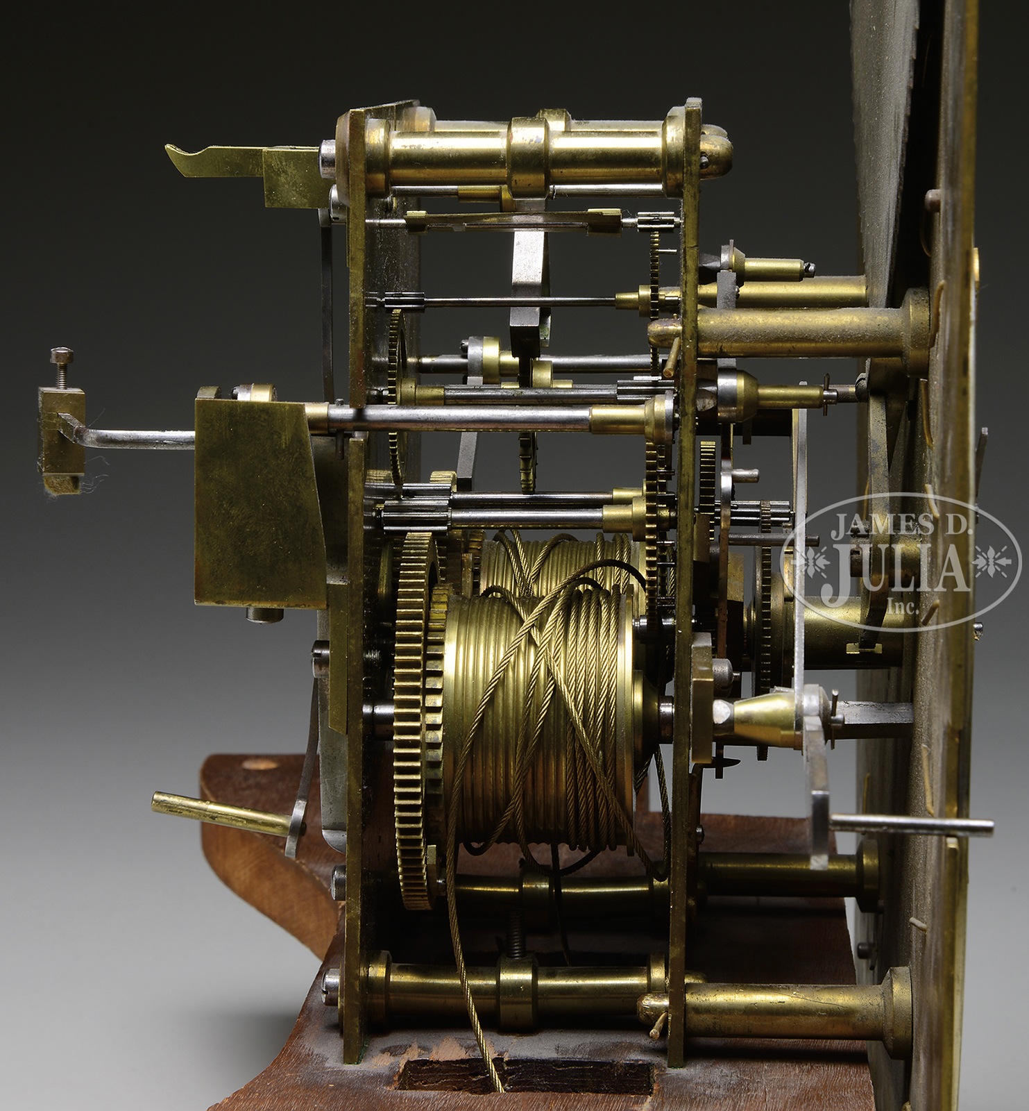 FINE J.C. JENNENS TALL CASE CLOCK.1st quarter 20th century, England. The neo-classical mahogany case with molded crest carved with shell and floral paterae above the molded top over astragal arched bevel glass door flanked by group of 3 doric colonettes opening to the silvered dial with moon phase dial within the arch above the Arabic chapter ring. The gilt brass face plate engraved with well detailed scrolling leaf tips and arabesque designs centering a subsidiary sweep seconds dial above time and strike apertures. The silvered chapter ring with Arabic numbers and engraved name plate reading “J.C. JENNENS & SON / GT Sutton Street- London.” The eight day original weight driven brass movement with brass clad weights and pendulum. The case with long beveled glass panel door with arched molded top and with scrolled spandrels flanked by doric columns, the whole raised on molded plinth. SIZE: 99″ h x 16″ d x 22″ w of throat. CONDITION: Very good overall, Seconds dial absent as noted. Minute hand has been bent but intact. 49752-1 (1,200-1,800) – Lot 2406
