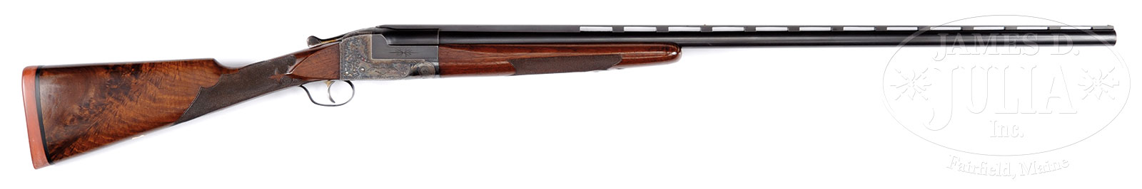 *FANTASTIC HIGH ORIGINAL CONDITION ITHACA FLUES GRADE 4 SINGLE BBL TRAP SHOTGUN.SN 269728-T. Cal 12 ga. 33-3/4″ bbl with 2-3/4″ chambers. Full choke. Full length matted ventilated top rib with twin ivory beads. Nickel-plated trigger, ejector, no safety. Straight grip stock checkered in fleur-de-lis and flowing wave pattern with gold shield at toe and 13-3/4″ LOP over Silver’s type recoil pad. Trap forearm is nicely checkered in fleur-de-lis and wave pattern with triangular ebony tip. Receiver is beautifully engraved, likely by McGraw, with American Eagle on right surrounded by flower and geometrical design engraving and man at the trap line on left in same floral pattern. Bottom of action nicely engraved in floral and leaf punch dot shaded pattern, as is top of action. Buttstock has particularly nice grain and flame. Weight: 7 lbs. 14 oz. PROVENANCE: The William Hammond Collection. Special Note: This item(s) contains plant or animal properties that may be covered by the Endangered Species Act (ESA). We have taken care to ensure that this item(s) meets the standard for sale under the ESA. However, certain states and other countries have laws that are more restrictive than the ESA. It is the bidder’s responsibility to ensure that it is lawful to purchase or transport this item(s) into their state, and to obtain the necessary import and export approvals. Delay or failure to obtain any such permit or approval does not relieve the buyer of paying for the item(s) and consummating the purchase. CONDITION: Extraordinarily fine retaining nearly all factory orig finish to both wood and metal. Bbl retains nearly all its orig blue with only a few rubs and minor oxidation. Buttstock and forearm are excellent with only minor handling marks and checkering is quite crisp. Pad may be an old replacement but has hardened. Receiver retains virtually all of its orig case color just starting to tone on bottom at front and top tang. Trigger guard retains approx 80% lightly toned blue. When admiring the beauty of this gun, it is easy to see how Ithaca outsold its competitors in the SBT market! 51407-1 JSL (2,000-4,000) C&R; ESA – Lot 2407