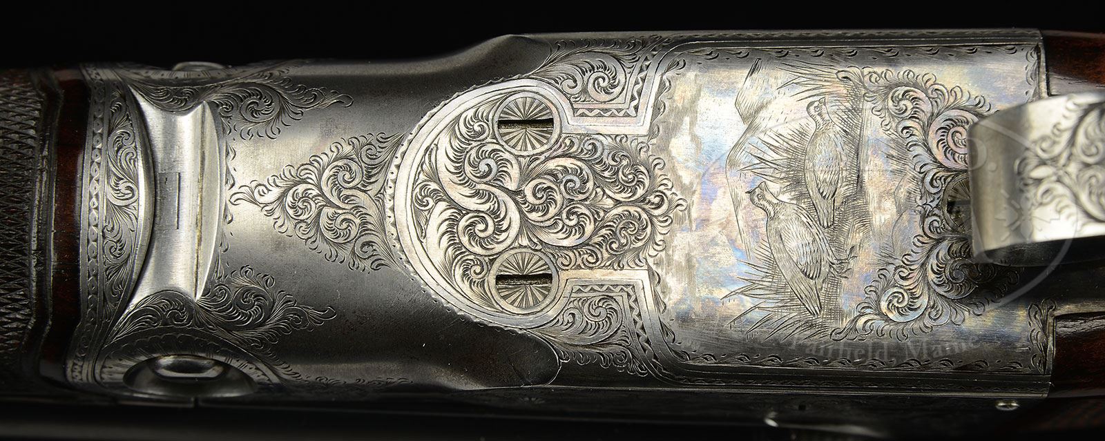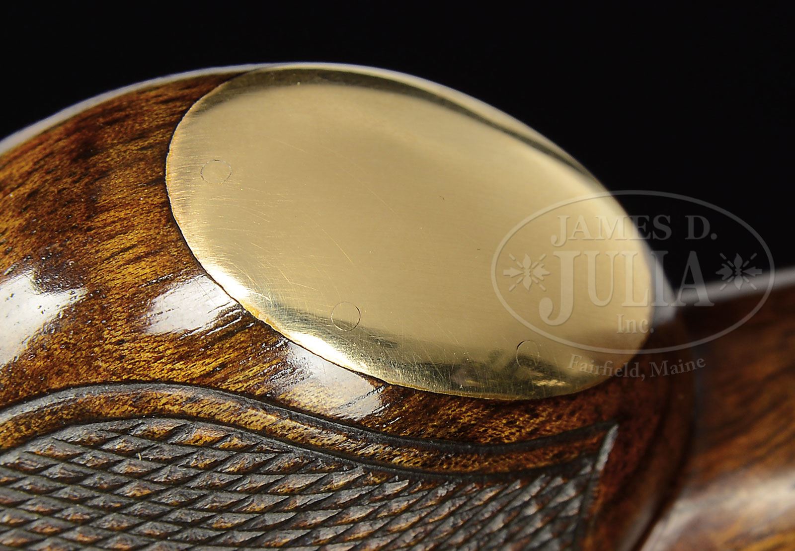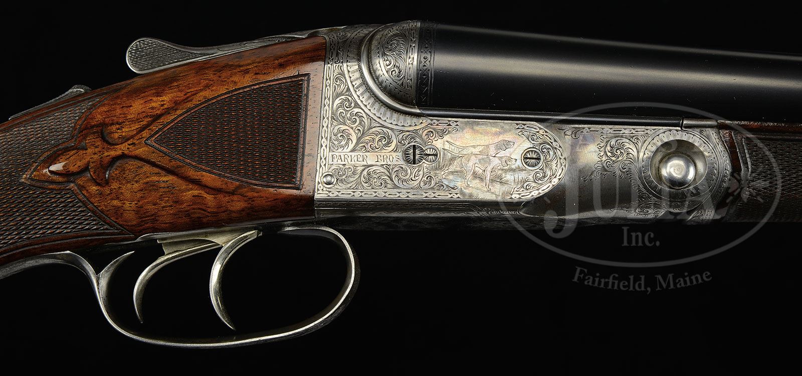 *SCARCE 20 GAUGE PARKER BHE.SN 214799. Cal. 20 ga. 3″ Chambers. 0 Frame. 26″ Bbls are marked with Parker address and “Acme Steel” on top rib. All correct marks are on water table and bbl flats. All specifications match those in the Parker Gun Identification and Serialization ledger. Case hardened action features automatic safety and nickel-plated double triggers, and is filed with single bead behind fences and chevron on top lever. It is engraved in typical “B” style with 70% coverage of scroll surrounding vignettes of double dogs on sides, and fine scene of quail in hilly background on trigger plate. “PARKER BROS” is in rectangle on each side of action. SN is on tang of scroll engraved and blued trigger guard. Nicely marbled and lightly figured European walnut round knob semi-pistol grip buttstock measures 14-3/8″ over skeleton steel buttplate. Stock is checkered in fleur-di-lis pattern and has checkered side panels. Drop points are carved with fleur-di-lis in classic “B” style. A vacant gold oval is set into tip of ball grip. Matching splinter ejector forend has 1901 patent date on iron. Bore diameter: left -.627, right -.627. Bore restrictions: left -.030 (full), right -.029 (full). Wall thickness: left -.022, right -.019. Drop at heel: 2-3/8″, drop at comb: 1-9/16″. Weight: 5 lbs 11 oz. LOP: 14-3/8″. CONDITION: Fine, as partially refinished. Bbls retain nearly all of a fine quality re-blue, engraving remains clear. Action retains most of its orig case color, which has faded somewhat overall. Presentation is a very pleasing tarnished silver. Stocks retain nearly all of a rubbed oil finish, over some light marks and with a few subsequent light scratches. Checkering perfectly re-cut. Bores are excellent. Action is tight. Screw slots are excellent. Ejectors are in time. A very scarce gun; only 109 made with Acme steel in 20 ga., 28 with 26″ bbls. 4-50451 MGM23 (27,500-47,500) – Lot 2409