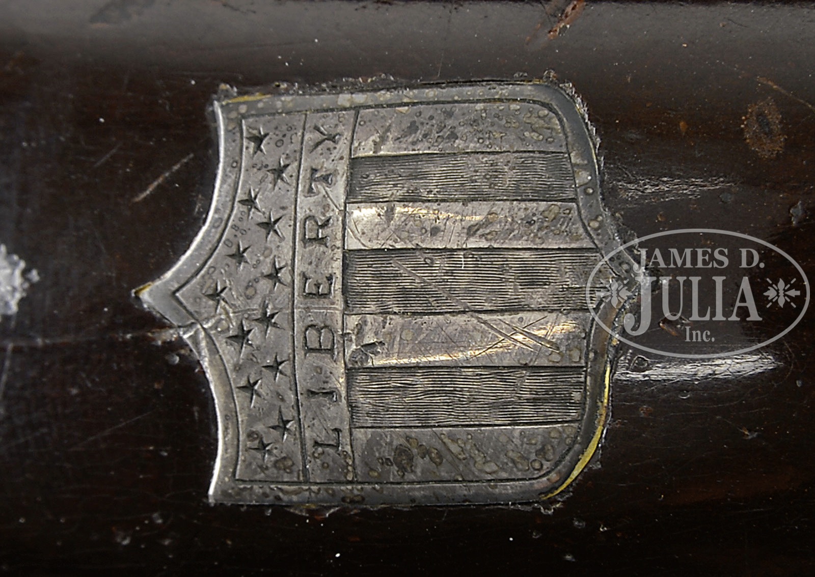UNMARKED DERINGER WITH 5-3/8″ BARREL AND UNIQUE WRIST INLAY DEPICTING A FEDERAL PERIOD FLAG.SN NSN. 5-3/8″ oct to rnd engraved 36 Cal. smooth bbl. Bbl with engraved tang. Overall 9-1/4″. No markings on engraved back action lock. Engraved German silver hardware. Heart shaped silver inlay opposite lock and 8 pointed star inlay on butt. Silver inlay behind bbl tang is a Federal Period American Flag with 13 stars over the word “LIBERTY”. Walnut stock is checkered on wrist. PROVENANCE: Frank Sujansky Collection. CONDITION: Good. Ramrod missing and some small patches of wood missing around lockplate. 4-49498 RG47 (800-1,200) – Lot 2410