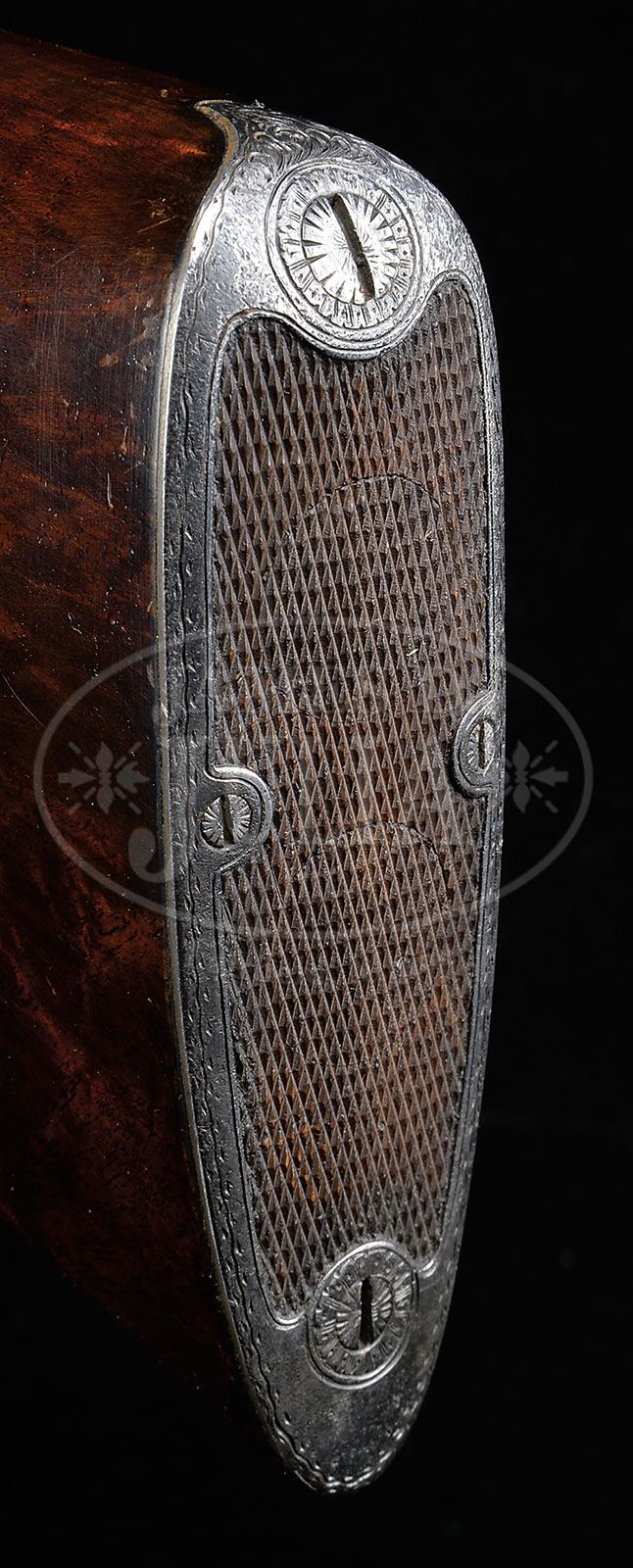 *RARE 28 GAUGE PARKER DHE.SN 238932. Cal. 28 ga. 2-3/4″ Chambers. 00 Frame. 28″ Bbls are unmarked on top rib. All correct marks are on water table and bbl flats. All specifications match those in the Parker Gun Identification and Serialization ledger, except that stock type is unspecified (typical for these later Remington Era Parkers). Case hardened action features automatic safety and nickel-plated single selective trigger. It is engraved in typical “D” style with 70% coverage of scroll surrounding vignettes of pointing dogs on sides, and quattro of quail in hilly background on trigger plate. “PARKER” is on bottom of action. SN is on tang of scroll engraved and blued trigger guard. Nicely flame figured American walnut capped pistol grip buttstock measures 14-3/8″ over skeleton steel buttplate. Stock is checkered in point pattern. Drop points are carved with lozenges in classic “D” style. A silver oval on toe line is engraved with monogram “DND” (?). Matching splinter ejector forend has SN on iron. This gun is in the same serial number range as several other DHE grade guns that are noted to have been engraved by Rudolph Kornbrath. It is possible that Kornbrath engraved this gun, though there is no way to definitively prove that. Bore diameter: left -.548, right -.549. Bore restrictions: left -.018 (mod), right -.033 (full). Wall thickness: left -.022, right -.022. Drop at heel: 2-1/2″, drop at comb: 1-1/2″. Weight: 6 lbs 0 oz. LOP: 14-3/8″. CONDITION: Excellent, as nicely refinished. Bbls retain nearly all of a lustrous re-blue. Action retains nearly all of a dark muted color re-hardening. Stocks retain nearly all of a dark varnish re-finish, over some light marks. Checkering competently re-cut. Bores are excellent. Action is tight. Ejectors are in time. Trigger works. A very scarce gun, with fewer than 200 made in this gauge, 54 with Titanic bbls 28″ long. 4-50443 MGM24 (32,500-52,500) – Lot 2410