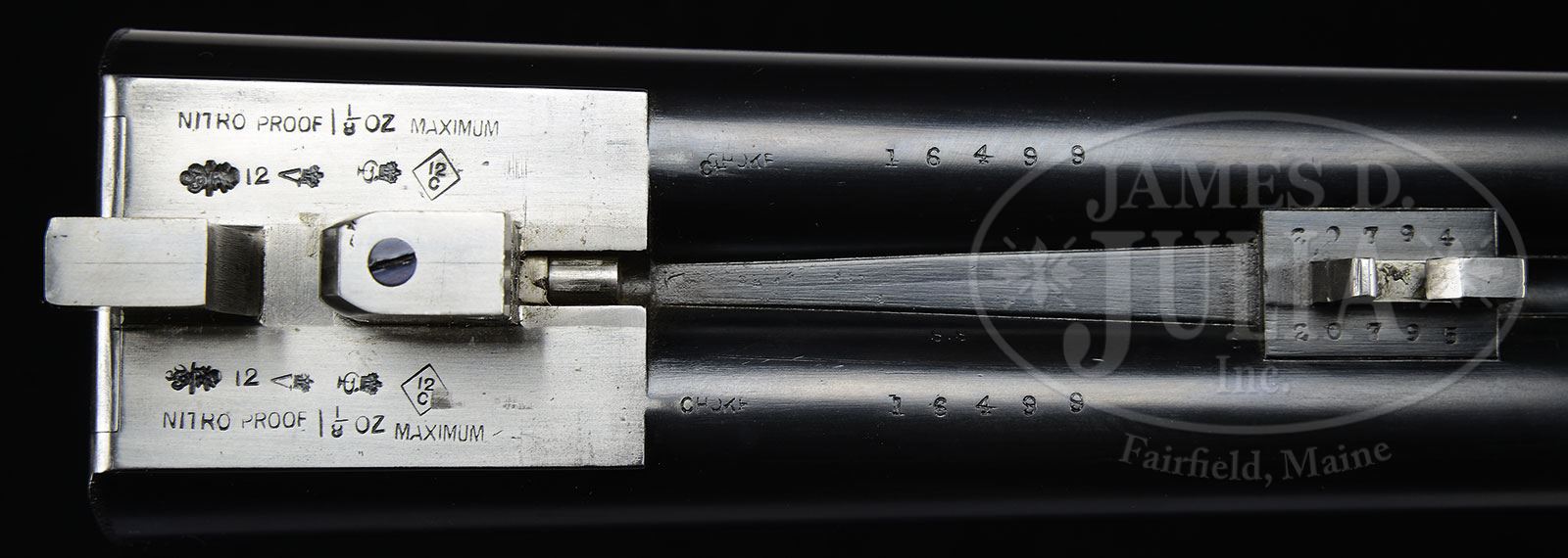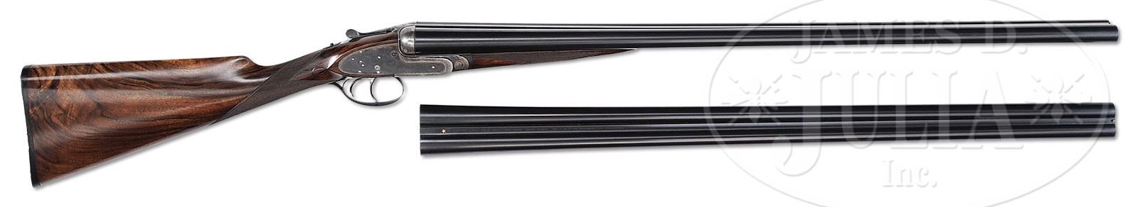 *VERY FINE JAMES PURDEY SIDELOCK HEAVY GAME GUN WITH EXTRA BARRELS AND CASE.SN 16499. (1899) Cal. 12 ga. 2-3/4″ Chambers. Two sets of 30″ chopper lump bbls with slightly swamped, narrow, game ribs engraved “J. Purdey & Sons Audley House, South Audley Street, London, Made of Sir Joseph Whitworth’s Fluid-Pressed Steel” are inlaid with gold stars at rear portions, and are marked “I” and “III”. (Another set of bbls, marked “II” is not present.) Bbl set “I” is stamped with London nitro proofs for 1-1/8 oz. Bottoms of both bbls are stamped “CHOKE”, and with SNs, and bottom of left bbl with makers initials “SS” (Sam Simons). Tube numbers “20794” and “20795” are on loop. Bbl set “III” is also stamped with London nitro proofs for 1-1/8 oz, but also with London proof for 2-3/4″ chambers. Bottoms of bbls are also marked “Choke” and with SNs. Bbl makers initials “GA” (George Aston) are on left bbl. Tube numbers “27755” and “27756” are on loop. (Factory records indicate that this third set of bbls was made in 1902, all w/ 2 3/4″ chambers.) Case hardened Beesley patent self-opening sidelock action features automatic safety (SAFE inlaid in gold), bushed strikers, engraved arrow tumbler head cocking indicators, and double triggers (front “loose”). (Factory records indicate “the gun was made with provision for later fitment of ejectors”.) Action and lockplates are engraved with exceptionally well cut small shaded scroll with rose bouquet highlights in Purdey house style, most likely the work of head engraver, J. Lucas. Blued top lever and trigger guard are also scroll engraved. SN is on long tang. Dark streaked and marbled, as well as lightly figured European walnut straight grip buttstock measures 14-3/4″ over coarsely checkered composition buttplate, and features typical drop points, grip checkering, and vacant silver oval on toe line. Matching splinter forend has Anson release. Iron is stamped with actioners initials “WN” (Wesley Nobbs). BBL set “I”: Bore diameter: left -.731, right -.731. Bore restrictions: left -.034 (full), right -.020 (mod). Minimum wall thickness: left -.028, right -.027. Drop at heel: 1-3/4″, drop at comb: 1-5/16″. Weight: 7 lbs 3 oz. LOP: 14-3/4″. BBL set “III”: Bore diameter: left -.731, right -.731. Bore restrictions: left -.026 (Imod), right -.011 (Lt mod). Minimum wall thickness: left -.028, right -.032. Drop at heel: 1-3/4″, drop at comb: 1-5/16″. Weight: 7 lbs 3 oz. LOP: 14-3/4″. Orig makers oak and leather case has brass corners and central brass medallion engraved “J A Fielden” (Factory records indicate gun was completed in Feb 1899 for Mr. J. A. Fielden). Interior is lined in scarlet cloth with small paper Purdey label (used between 1883 and 1901) in lid. Case contains heavy 3-pc ebony and brass cleaning rod with brush and mop (most likely made for an 8 or 10 bore), 12 bore chamber brush with ebonized handle, Purdey marked square oil bottle, pair of snap caps, horn handled striker key, pair of horn handled Purdey marked turnscrews, and a black morocco wallet containing 12 ga mop and two brushes, also in case are two keys. PROVENANCE: Factory letter with copy of ledger page, as well as an old Cogswell & Harrison hang tag for this gun. CONDITION: Excellent. Both bbls retain essentially all of a London quality re-black, engraving remains sharp and clear. Action retains approx 60% orig case hardening color, vivid where protected, silvering on fences, beads, and bottom of action from normal hand wear. Lockplates retain essentially all of their case hardening color, and traces of what appears to be orig lacquer. Top lever and trigger guard have been re-blued, and retain essentially all of that blue. Stocks retain nearly all of a very fine hand rubbed oil finish with a few light marks, checkering lightly worn. Bores are excellent, bright and shiny throughout. No visible imperfections, except a few very light flecks toward muzzles of bbl set “I”. Action is tight with both sets of bbls, and they are both on face. Drop is good. Case leather is still mostly light in color, but has numerous stains, rubs, and marks. Straps and handle are good. Interior cloth is fine with marks and soiling, mostly from bbls. Accessories are good. Label is very fine. A lovely turn of the century Purdey with lots of orig color, and very useful combination of bbls. 4-55198 (20,000-30,000) – Lot 2410 Click here to view provenance