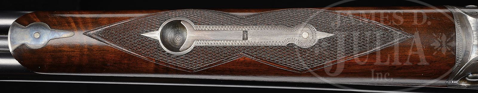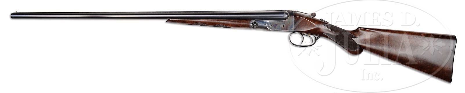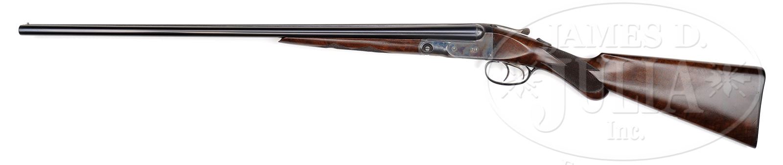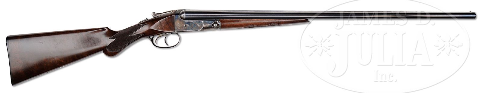 *TRULY EXCEPTIONAL, INVESTMENT QUALITY, 28 GAUGE PARKER VHE.SN 238798. Cal. 28 ga. 2-3/4″ Chambers. 00 Frame. 26″ Bbls are marked with Parker address and “VULCAN STEEL” on top rib. All correct marks are on water table and bbl flats. All specifications match those listed in The Parker Gun Identification and Serialization ledger, except stock style is not specified. Case hardened action features automatic safety and double triggers. Action is engraved with wiggle borders in “V” style. “PARKER” is on bottom of action. SN is on tang of border engraved and blued trigger guard. Lightly figured American walnut round knob semi-pistol grip buttstock measures 14-1/2″ over dogs-head buttplate. Stock is checkered in point pattern. A German silver shield is on toe line. Matching splinter ejector forend has SN on iron. Bore diameter: left -.550, right -.550. Bore restrictions: left -.030 (full), right -.017 (mod). Wall thickness: left -.033, right -.031. Drop at heel: 2-3/8″, drop at comb: 1-5/8″. Weight: 5 lbs 12 oz. LOP: 14-1/2″. CONDITION: Truly exceptional, retaining nearly all of its factory finishes on wood and metal, with only a few of the faintest marks on bbls. Damascening on breech ends is excellent. There are some dull spots in case hardening on action along with some slight edge wear. Forend latch is mostly silver from normal carry wear. Trigger guard retains most of its blue, but is brown at grip, and considerably flaked on bow. Stocks are exceptional with only a few minor marks overall, except for two fairly deep scratches on toe line, checkering sharp. Bores are excellent. Mechanically crisp. It’s hard to imagine ever finding a better specimen of this scarce small bore Parker. 4-50446 MGM42 (35,000-45,000) – Lot 2411
