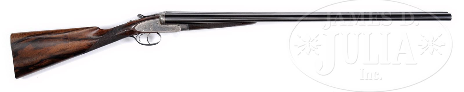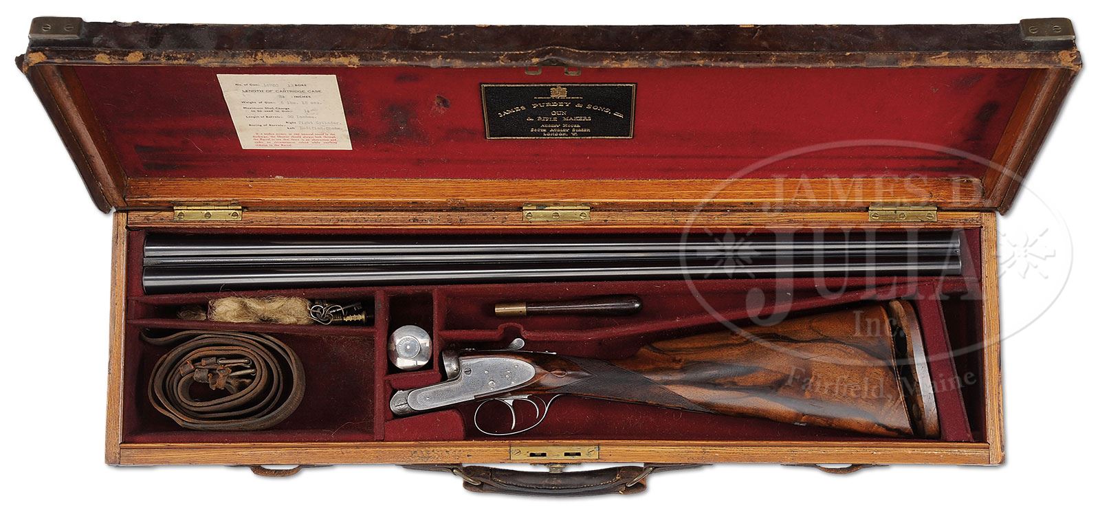 *JAMES PURDEY SIDELOCK EJECTOR GAME GUN WITH ORIGINAL OAK AND LEATHER CASE.SN 16700. (1899) Cal. 12 ga. 2-1/2″ Chambers. 30″ Chopper lump bbls are engraved “J. Purdey & Sons. Audley House. South Audley Street. London. Made of Sir Joseph Whitworth’s Fluid Pressed Steel” on narrow game rib. Bbl flats are stamped with London nitro proofs for 2-1/2″ chambers. Bottoms of bbls are stamped with SNs, and bbl makers initials “AP” (?). Tube numbers “22941” and “22942” are on loop. Typical Beesley patent self-opening action features automatic safety (SAFE inlaid in gold), bushed strikers, engraved arrow tumbler end cocking indicators, and double triggers. Action and lockplates are engraved with Purdey house style small scroll with rose bouquet highlights. “J. Purdey & Sons” is on each lockplate and “Purdey’s Patent” is on bottom of action. Blued top lever and trigger guard are also scroll engraved. SN is at grip. Broadly marbled and lightly figured European walnut straight grip buttstock measures 14-1/4″ over checkered wood butt. (Stock has been shortened from orig length with 5/8″ orig remnant in case). Stock features drop points, point pattern checkering with mullered borders at grip, and a silver oval on toe line engraved “LAR”. Matching splinter ejector forend has Anson release. Actioners initial “C” for Crisp (first name unknown) is on iron. Bore diameter: left -.731, right -.731. Bore restrictions: left -.021 (Mod), right -.011 (IC). Minimum wall thickness: left -.028, right -.029. Drop at heel: 2-1/4″, drop at comb: 1-1/2″. Weight: 6 lbs 11 oz. LOP: 14-1/4″. Makers orig oak and leather case with brass corners and circular central medallion, is embossed “L. A. R.” on top. Case is lined in scarlet cloth with gold embossed black leather Purdey label in lid, along with charge card for this particular gun. Case contains 2-pc greenheart and brass cleaning rod with short handle, jag, case straps, and a Purdey marked round oil bottle, along with aforementioned orig piece of stock, and the key. PROVENANCE: Richard Schreiber Collection. CONDITION: Fine, as partially refinished. Bbls retain most of an old re-black over numerous minor marks and nicks, with a few subsequent marks, rib engraving picked up. Action retains traces of case hardening color where protected, is overall pewter gray. Lockplates retain a considerable amount of their orig color, perhaps 30%, left plate a bit more. Top lever and trigger guard retain most of an old re-black, engraving somewhat soft. Stocks retain a good amount of what appears to be their orig rubbed oil finish with numerous light marks and scratches, checkering slightly worn, possibly re-cut on forend. Bores are very fine, with some light pitting and frosting. Action is tight. Bbls are on face. Drop is good. Ejectors are in time. Case leather is very dark with a considerable number of rubs, especially on edges, and many scratches. Handle is good. Straps are a bit tattered. Interior cloth is good, with considerable soiling, and a number of rubs, some through. Purdey label is excellent. Charge card is fine. Accessories are good. A decent old Purdey, with bbls that measure well, and are to orig specs. 4-45953 (10,000-15,000) – Lot 2412