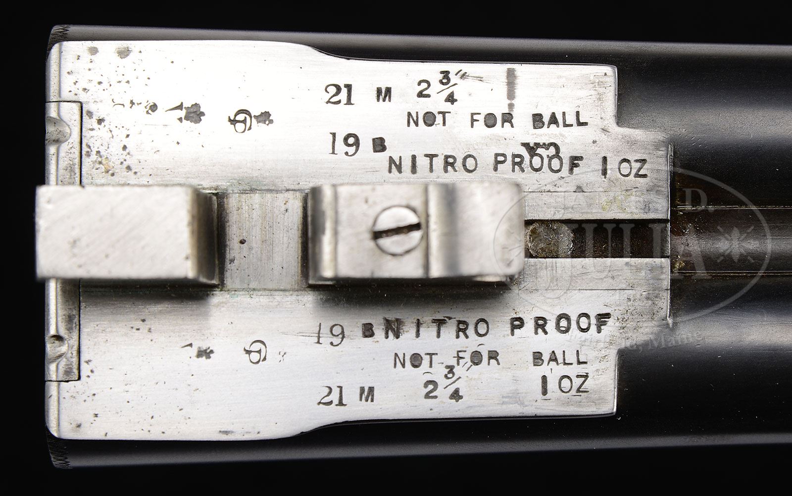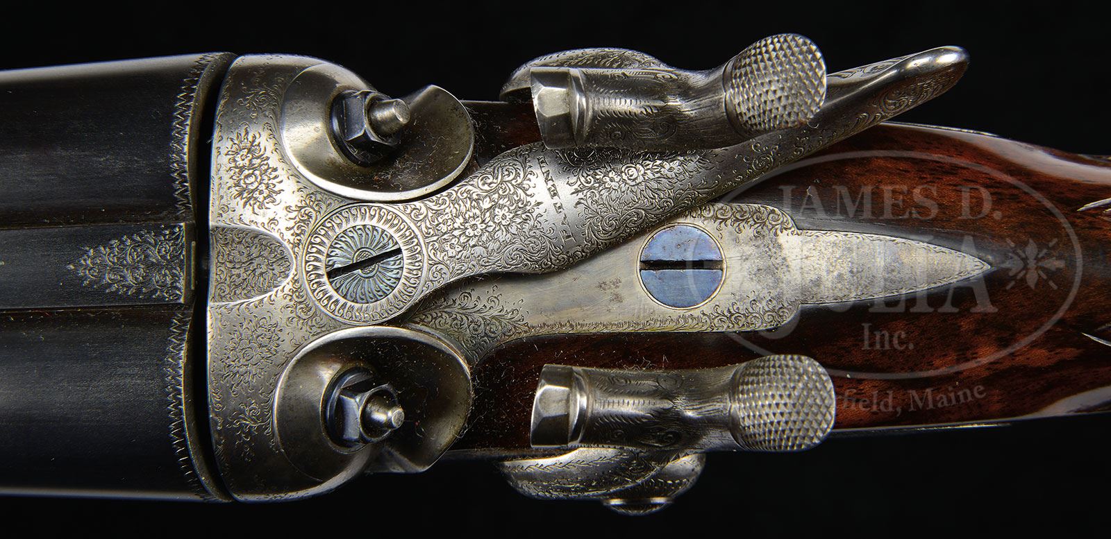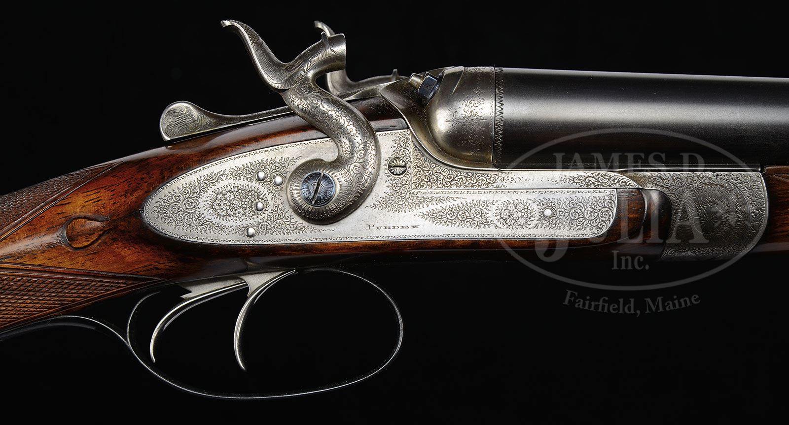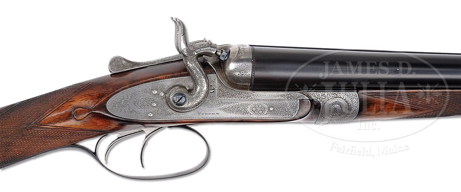 Please Note: The barrels are slightly off face, but the gun is tight on the hinge pin with forend off. JAMES PURDEY 20 GAUGE BAR IN WOOD HAMMER GUN ONCE OWNED BY ALFRED, DUKE OF EDINBURGH.SN 9883. (1877) Cal. 20 ga. 2-3/4″ Chambers. 27″ Bbls have been mono-blocked, and are engraved “J. Purdey & Sons. Audley House. South Audley Street. London. Made of Sir Joseph Whitworth’s Fluid Pressed Steel” on narrow, slightly swamped game rib. Bbl flats are stamped with London black powder proofs and early choke markings, along with “Not for Ball”, and “Nitro Proof 1 Oz.” There are no modern proof marks or re-proof marks. Coin finished bar-in-wood action is fitted with top lever and rebounding bar locks sporting tall round bodied serpentine hammers with engraved dolphin heads. Action, lockplates, and hammers are engraved with well cut small scroll and rose bouquets. “Purdey” is on each lockplate. Top lever is engraved “Patent”. Blued trigger guard is also scroll engraved and has SN at grip. Finely marbled and figured Circassian walnut straight grip buttstock measures 14-1/4″ over brown leather covered pad. Stock features drop points, and standard point pattern checkering with mullered borders. A silver oval on toe line is engraved with plumed knight’s helm over a crown flanked by foliage all over motto “God is My Help” on riband. A Wikipedia search shows that this is the crest of Alfred, Duke of Edinburgh, second son of Queen Victoria. The Dukedom was created in 1866. Matching splinter forend has Anson release. Bore diameter: left -.610, right -.616. Bore restrictions: left -.013 (Lt Mod), right -.010 (IC). Minimum wall thickness: left -.033, right -.030. Drop at heel: 2-1/8″, drop at comb: 1-5/8″. Weight: 5 lbs 8 oz. LOP: 14-1/4″. Also included is a nicely made leather carrying case marked “Chasse L’Etang”. PROVENANCE: Thomas W. Connally Estate Collection. CONDITION: Very good, as partially refinished. Bbls retain nearly all of a fine satin blue, done at time of sleeving. Joint line is nearly invisible. Action has been cleaned to silver gray, engraving still clear, with some light pitting at bottom of knuckle. Stocks have been refinished in oil, and retain nearly all of that finish with a few light marks. Checkering has been re-cut. Bores are excellent. Action is tight. Bbls are on face. Locks crisp. A great handling shooter with an interesting association. Case is excellent. 4-55672 (8,000-12,000) – Lot 2414