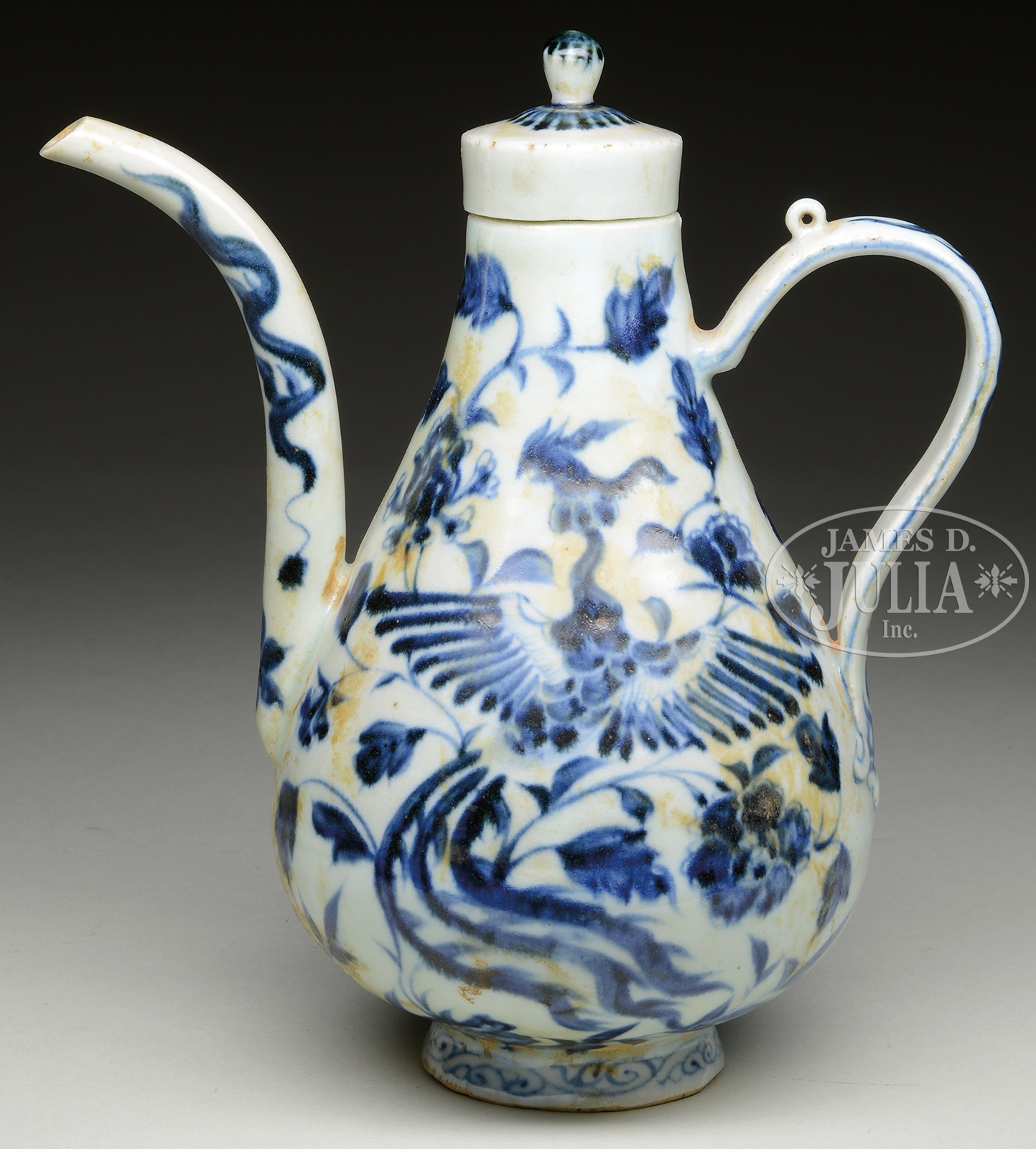 YUAN STYLE BLUE AND WHITE EWER.China. The blue and white ewer in Yuan Dynasty period design, with phoenix motif. SIZE: 9-1/4″ h CONDITION: Discoloration. 7-75591 (200-300) – Lot 2414
