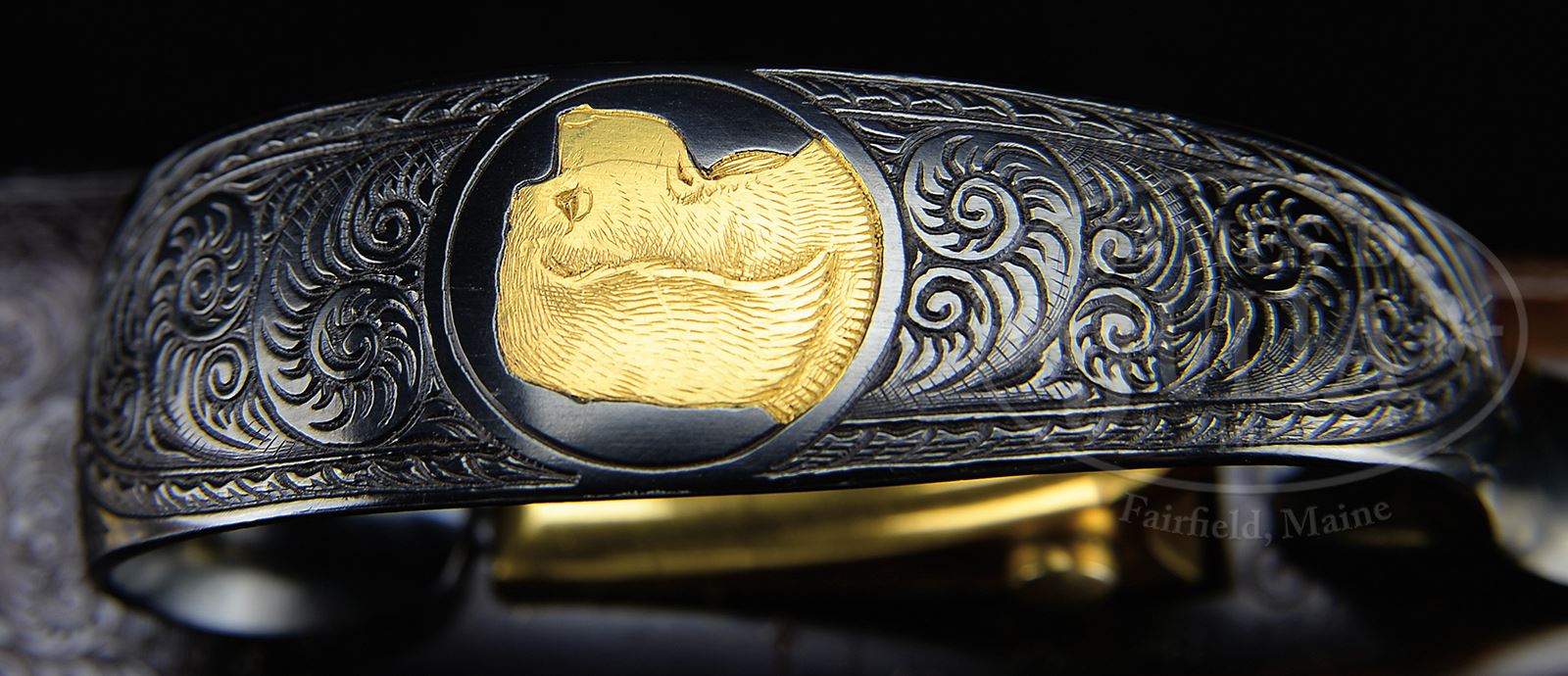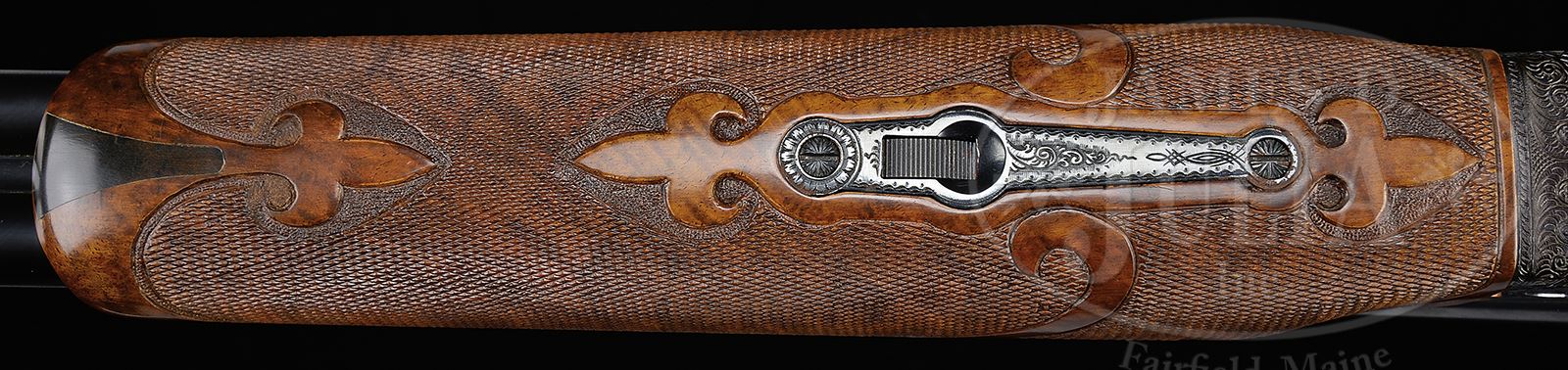 *VERY FINE 20 GAUGE WINCHESTER MODEL 21 “GRAND AMERICAN” TWO BARREL SET WITH ORIGINAL CASE.SN W32999. (1973) Cal. 20 ga. 3″ Chambers. Both bbl sets are 26″ and fitted with raised, matted, ventilated ribs. Rear portion has milled out area engraved with owners name. There are 3″ triangles of varying sized scroll at breech ends. Engine turned bbl flats are stamped with matching numbers. Each set has its own forend, and bbls are stamped “1” and “2” on loops and front portions of forend irons. Bbl set “1” is choked skeet and skeet, and “2”, mod and full. Blued flat side action features automatic safety and gold-plated sgl selective trigger. Action is engraved in typical “21-6” style with flush gold inlays, typical of “Grand American” Model 21’s. Fences are carved with oak leaves. Remainder of action is near fully engraved with scroll surrounding vignettes of gold inlaid dogs and birds; a pointing setter on left side, and a pointing pointer on right. Bottom of action depicts a pair of gold inlaid pheasant. Trigger guard bow has a gold portrait of a dog. Fine, feather crotch figured American walnut straight grip buttstock measures 13″ over black leather covered pad. Stock and both matching beavertail forends are carved in “21-B” style. BBL set “1”: Bore diameter: left -.612, right -.612. Bore restrictions: left -.007 (skeet), right -.005 (skeet). Drop at heel: 2-3/16″, drop at comb: 1-3/16″. Weight: 6 lbs 14 oz. LOP: 13″. BBL set “2”: Bore diameter: left -.616, right -.613. Bore restrictions: left -.030 (full), right -.012 (mod). Drop at heel: 2-3/16″, drop at comb: 1-1/4″. Weight: 6 lbs 14 oz. LOP: 13″. Brown leather VC case with stitched leather corners has leather trimmed canvas outer cover. Interior is lined in burgundy cloth, and has space for gun and both sets of bbls. PROVENANCE: Winchester letter confirming all specifications of this “Grand American” including 2nd set of bbls, gold name in panel, and leather covered pad. CONDITION: Excellent, close to new, with evidence of light field use, with a few light dings and scratches in metal, mostly on bbl set “2”. Action shows a hint of silvering on sharp edges. There are a number of marks on stock, mostly some chips through finish and some scratches on lower portion of butt. Bores are excellent. Mechanically crisp. Case leather is excellent, as protected by its outer cover, which has some rubs. Interior cloth is excellent. A fine, original Grand American. 49445-9 MGM402 (25,000-35,000) – Lot 2414 Click here to view provenance