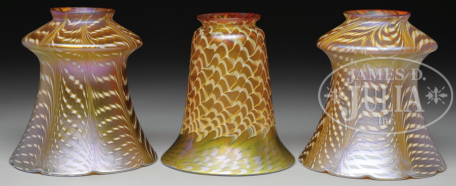 THREE QUEZAL SHADES.1) Pair of Quezal shades have gold iridescent fishnet pattern against a cream colored background. Interior of each shade is finished in bright gold iridescence and each shade is signed on fitter “Quezal”. 2) Quezal shade has cream colored snakeskin design covering two-thirds of the vase with the bottom third changing to a green snakeskin, all against a gold iridescent background. Signed on fitter “Quezal”. SIZE: Each is 5-1/4″ t. CONDITION: One tiny flake to fitter rim on one of the fishnet shades. Otherwise very good to excellent. 5-68443 (500-800) – Lot 2416