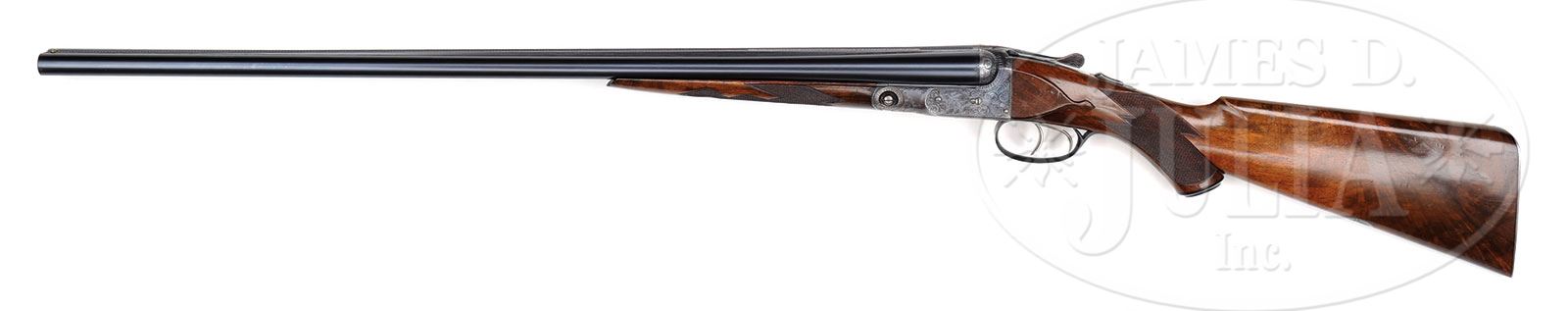 *FINE ORIGINAL CONDITION 20 GAUGE PARKER DHE.SN 236488. Cal. 20 ga. 2-5/8″ Chambers. 0 Frame. 28″ Bbls are marked with Parker address and “Titanic Steel” on top rib. All correct marks are on water table and bbl flats. All specifications match those in the Parker Gun Identification and Serialization ledger. Case hardened action features automatic safety and double triggers, and is engraved in typical late “D” style with 70% coverage of scroll surrounding vignettes of dogs on sides, and quattro of pheasant, one standing, three flying, on trigger plate. “PARKER” is on bottom of action. SN is on tang of scroll engraved and blued trigger guard. Finely crotch figured American walnut capped pistol grip buttstock measures 14-3/8″ over skeleton steel buttplate. Stock is checkered and carved with lozenge shaped drop points in classic “D” style. A silver oval on toe line is engraved with monogram “JBW”. Matching splinter ejector forend has 1901 patent date on iron. Bore diameter: left -.613, right -.616. Bore restrictions: left -.021 (Full), right -.010 (Mod). Wall thickness: left -.027, right -.025. Drop at heel: 2-7/16″, drop at comb: 1-1/2″. Weight: 6 lbs 9 oz. LOP: 14-3/8″. CONDITION: Excellent. Bbls retain over 95% of what appears to be orig blue, with only a few light marks and minor thinning. Action retains 70 -80% orig case hardening color, silvered and browning at bottom from normal carrying wear. Stocks retain nearly all of their orig varnish finish with some chips, light scratches, and marks. Checkering is quite fine, with little wear. Bores are excellent. Action is tight. Ejectors are strong and in time. A fast handling, late Parker with excellent dimensions. 4-51323 MGM20 (19,000-24,000) – Lot 2419