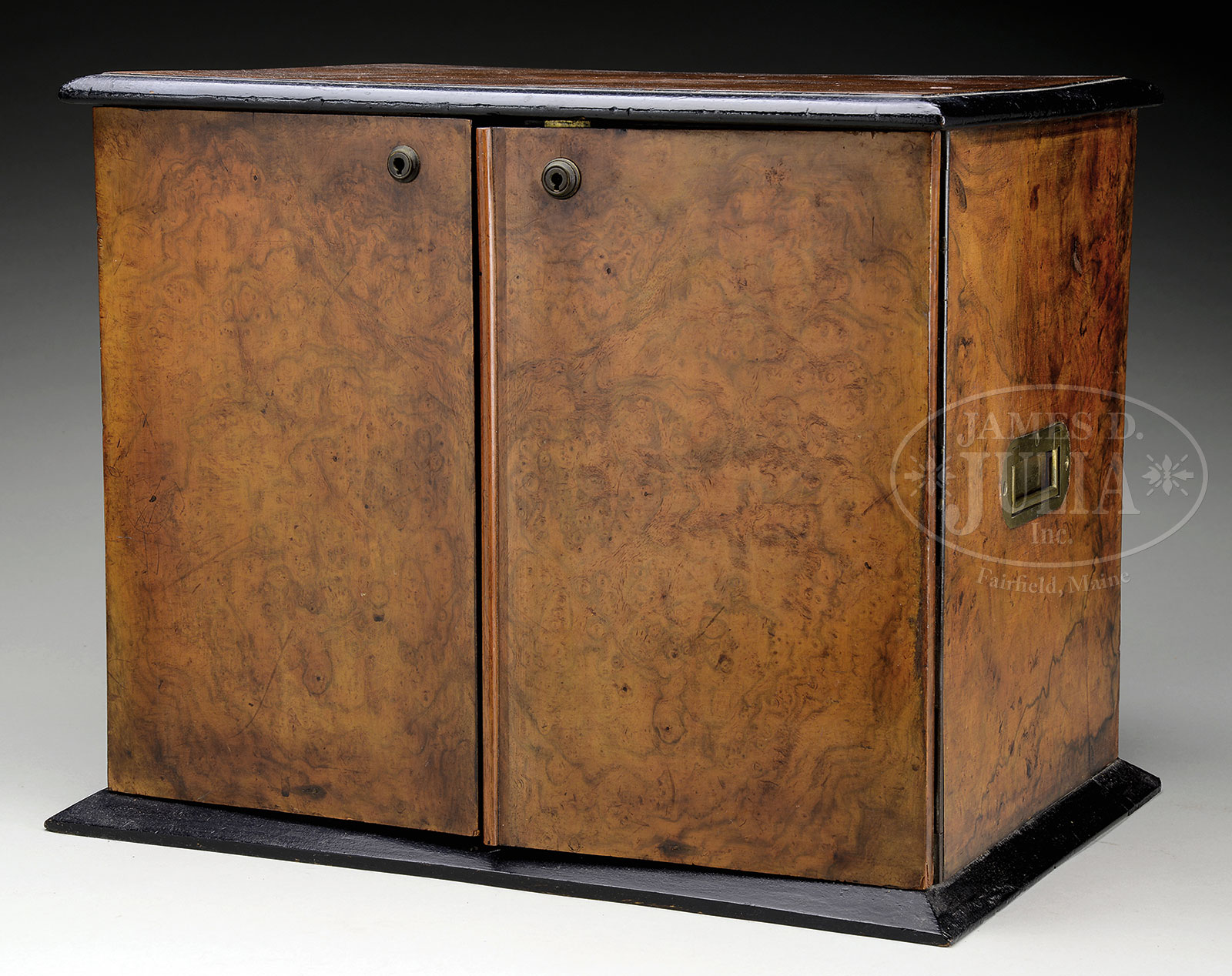 CAMPAIGN STYLE BURL WALNUT AND MAPLE TRAVELING WRITING CABINET.Mid 19th century, England. This campaign style rectangular cabinet with well figured burl walnut bookend veneers with ebonized trim. The case sided mounted with campaign style brass carrying handles. The cabinet with a pair of doors opening to an interior fitted with three aligned valanced pigeonholes above a pair of aligned short drawers over three long drawers, the lower drawer opening to a hinged writing desk with original embossed leather writing surface and with pen tray and inkwell. All with figural maple drawer fronts and brass campaign style ring pulls. SIZE: 13-1/4″ h x 16″ w x 11-3/4″ d. CONDITION: Cabinet with original surface with good rich tea brown color and undisturbed patina, normal and light in-use wear. Very good overall. 51826-9 (800-1,200) – Lot 2419