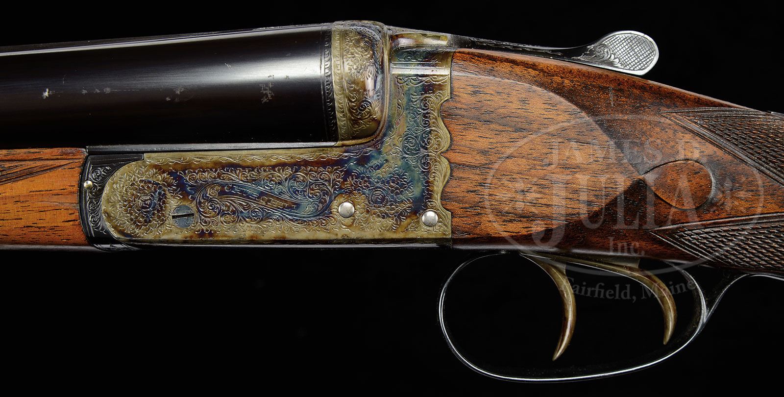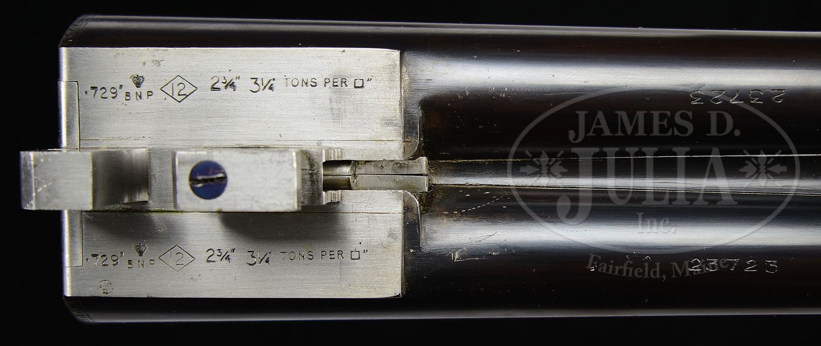 SN 23723. Cal. 12 ga. 2-3/4″ Chambers. 25″ Dovetailed bbls with raised, matted, Churchill rib gold inlaid “XXV” at rear, are engraved “Churchill (Gunmakers) Ltd.” and “61 Pall Mall, St James’s London, England.” on tops. Bbl flats are stamped with Birmingham nitro proofs for 2-3/4″ chambers. SNs are engraved on bottoms of bbls. Case hardened, scallop-backed boxlock action features automatic safety (SAFE inlaid in gold) and double triggers. Action is engraved with shaded scroll with rose bouquet highlights. “Churchill” is in scroll terminated banner on each side. Top lever, floorplate, and trigger guard are blued, and also scroll engraved. “THE REGAL” is engraved on floorplate. SN is on trigger guard tang. Lightly streaked, and with interesting quilted figure, European walnut straight grip buttstock measures 14-3/8″ over checkered wood butt. Stock features drop points, classic point pattern checkering with mullered borders, and a vacant gold oval on toe line. Matching splinter ejector forend has Anson release. Bore diameter: left -.728, right -.727. Bore restrictions: left -.022 (Mod), right -.017 (Lt Mod). Minimum wall thickness: left -.030, right -.032. Drop at heel: 1-7/8″, drop at comb: 1-3/8″. Weight: 6 lbs 4 oz. LOP: 14-3/8″. Makers VC leather case with stitched leather corners is lined in burgundy cloth, and has gold embossed black leather Churchill label in lid. Case contains 2-pc walnut and brass cleaning rod with mop, brush, and jag. PROVENANCE: Factory order sheet dated 1976, and invoice from Orvis dated Aug 1987. Richard Schreiber Collection. CONDITION: Exceptionally fine, near new with some slight flecking on bbls, and a hint of silvering on sharp edges of action. Thumbpiece of top lever has a hint of silver. Trigger guard retains essentially all of its bright blue. Stocks have a few light marks and scratches in their orig finish. Bores are excellent, with no noticeable imperfections. Action is tight. Bbls are on face. Ejectors are strong and in time. Case leather is excellent, with a few minor marks and scuffs. Handle is excellent. Interior cloth is very fine, with some marks and rubs from contact with gun, and light soiling from bbls. Accessories are excellent. Lately short barreled guns are out of vogue, but the XXV is very well suited to grouse and woodcock hunting in New England, as well as in any close cover. 4-45956 (2,500-3,500) – Lot 2420