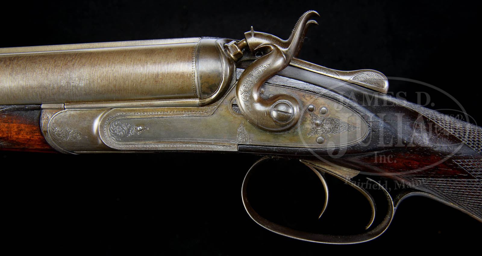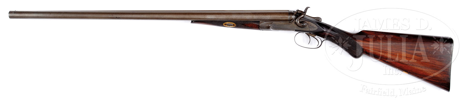 SCARCE A.G. GENEZ 10 GA HAMMER SHOTGUN.SN 667. Cal. 10 ga.28-1/2″ twist steel bbl with laminated top rib and brass front bead. 2-7/8″ chamber. Bbl flats marked “Canonner.A.Paris” and water table marked “Chas Green/Rochester N.Y.”. Dbl triggers, extractor, round ball grip checkered in three-point pattern with repair running behind both locks and 14-1/4″ LOP over full steel buttplate with brass shield near toe. Splinter forearm with wedge fastener and horn tip checkered in three-point pattern. Receiver is lightly scroll engraved as is trigger guard and top lever. Hammers are nicely knurled and fishhead engraved on tops. Weight: 8 lbs. 0 oz. CONDITION: Good to very good for this unusual maker. Bbls are very good with light staining and a few minor pings though retain most of their pattern. Buttstock and forearm are restored and retain most of of an old coat of heavy varnish. Buttstock with separation behind locks as noted above which should be repaired. Receiver with a heavy coat of old varnish. May clean and there could be case color underneath the varnish. There is some play in the action and bbls are slightly off the face. Bores are good with scattered beginning erosion. Mechanics are good. 51567-13 JSL (1,750-2,500) – Lot 2422