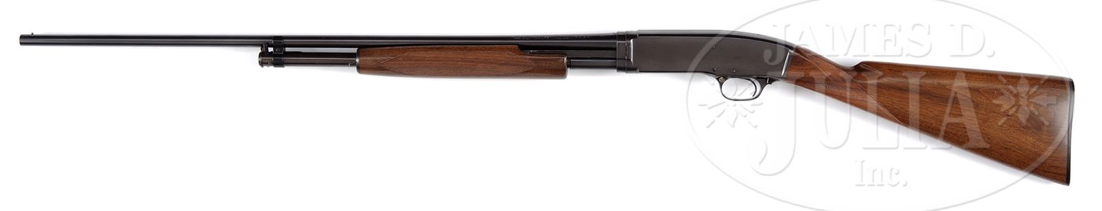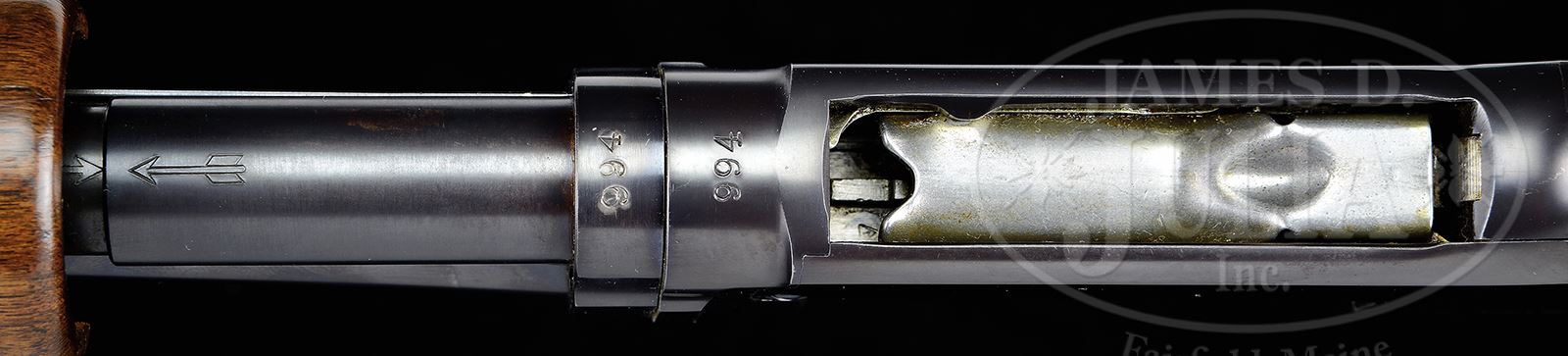 *RARE 1ST YEAR OF PRODUCTION SKEET GRADE WINCHESTER MODEL 42 PUMP ACTION SHOTGUN.SN 994. Cal. 410. Fine, deluxe 42 with 28″ plain bbl marked “SKEET” and for 3″ shells. Mounted with nicely figured, American walnut with large deluxe rnd forearm, that has checkered side panels and straight stock with Winchester trademark hard rubber buttplate. This early skeet grade was introduced in about 1933 and offered with plain bbl until 1938. Other skeet grade Model 42 shotguns were offered, but with either solid or ventilated rib, making this a very rare Winchester shotgun. Few survive today in completely orig configuration with orig finish. CONDITION: Extremely fine. Overall retains about 99% crisp orig finish with strong bright blue and orig oil finish on stocks with bright, crisp checkering. Left side of receiver has a light surface mar. Mechanics are crisp. Brilliant shiny bore. Appears to be new and unfired. 48867-1 JR C&R (4,500-7,500) – Lot 2423