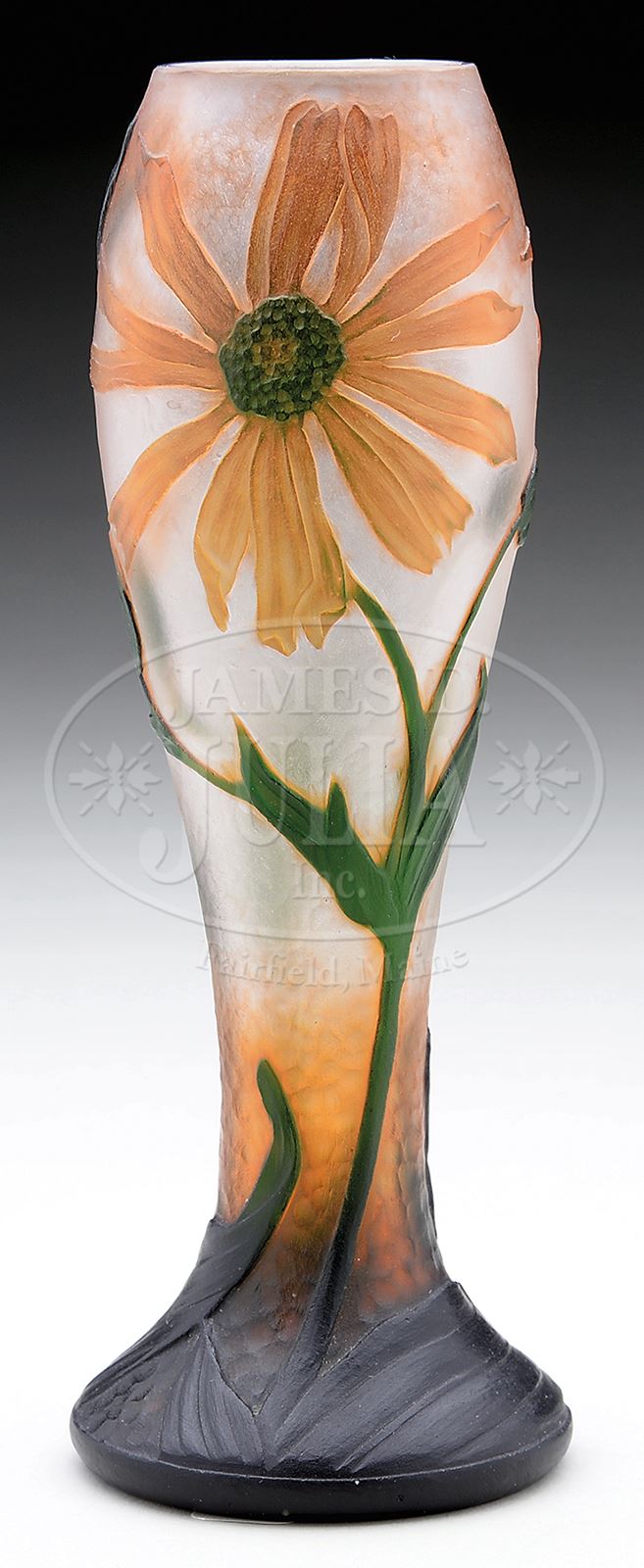 DAUM NANCY MARTELE & CAMEO VASE.Daum vase has wheel carved cameo decoration of green leaves and stems leading to amber flowers all with wheel carved detail. Signed on the underside with etched and gilt signature “Daum Nancy” with cross of Lorraine. SIZE: 6-3/4″ t. PROVENANCE: From the Unreserved Collection of Dr. & Mrs. Brian Bojesen. CONDITION: Very good to excellent with some scratches to interior that are visible from the exterior. 50361-49 (1,000-1,500) – Lot 2424