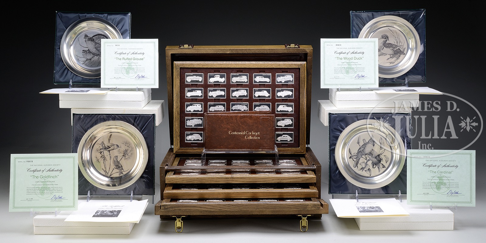 LOT OF FRANKLIN MINT COLLECTORS SILVER.Lot consisting of The Franklin Mint Centennial ingot car collection made up of one hundred sterling silver ingots each celebrating various automobiles set in wood case, total weight of set approximately 208 troy oz, comes with collection book. Along with four Franklin Mint Audubon Society sterling silver collector plates, group includes the cardinal, the wood duck, the gold finch, and the ruffed grouse. All in box with original paperwork. Each are sealed in original packaging. Plates have not been weighed due to packaging. SIZE: Each plate 8″ dia. CONDITION: Very good. 51396-3 (2,500-3,500) – Lot 2424