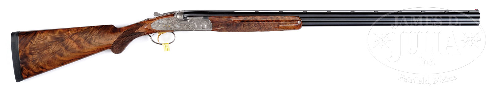 *DYNAMIC CONNECTICUT SHOTGUN A-10 20 GA SHOTGUN AS NEW IN MAKER’S CASE.SN A10-001602. Cal. 20 ga. 30″ bbl. 2-3/4″ chambers with five choke tubes included. Full length low profile matted ventilated top rib with red plastic front bead. Bbls marked “Platinum” on left side of top tube. Gold plated sgl selective trigger, auto ejectors, non-auto safety. Round knob pistol grip buttstock of flame grained American Walnut checkered in two-point pattern with 14-3/4″ LOP over black “Galazan” rubber buttpad. Matching forearm is checkered in four-point pattern with Deeley release. Engraved in standard “Platinum” pattern with pheasants in farm scene on right and left surrounded by nicely executed scroll engraving. Bottom of frame with harvested pheasant in the mouth of what appears to be a Lab surrounded by finely executed scroll engraving. Housed in its orig Galazan/CSM A-10 American steel case with black velvet liner. Included in case is orig instruction manual and choke tube set which are in their leather housing. Weight: 6 lbs. 6 oz. CONDITION: As new and test fired only. Our consignor purchased this gun new from Connecticut Shotgun and has never fired it. Orig warning tag still remains on trigger guard bow. Mechanics are excellent. Bores are brilliant and shiny, as one would expect with a new gun. These are rugged guns, suitable for any standard shot material in the world today. 51406-8 JSL (6,000-10,000) – Lot 2427