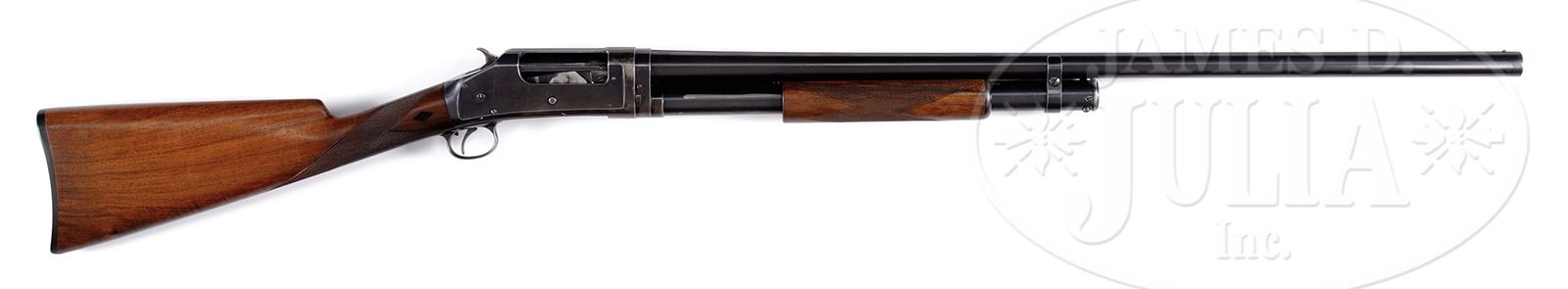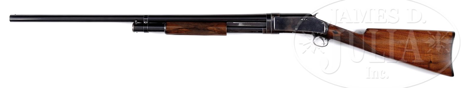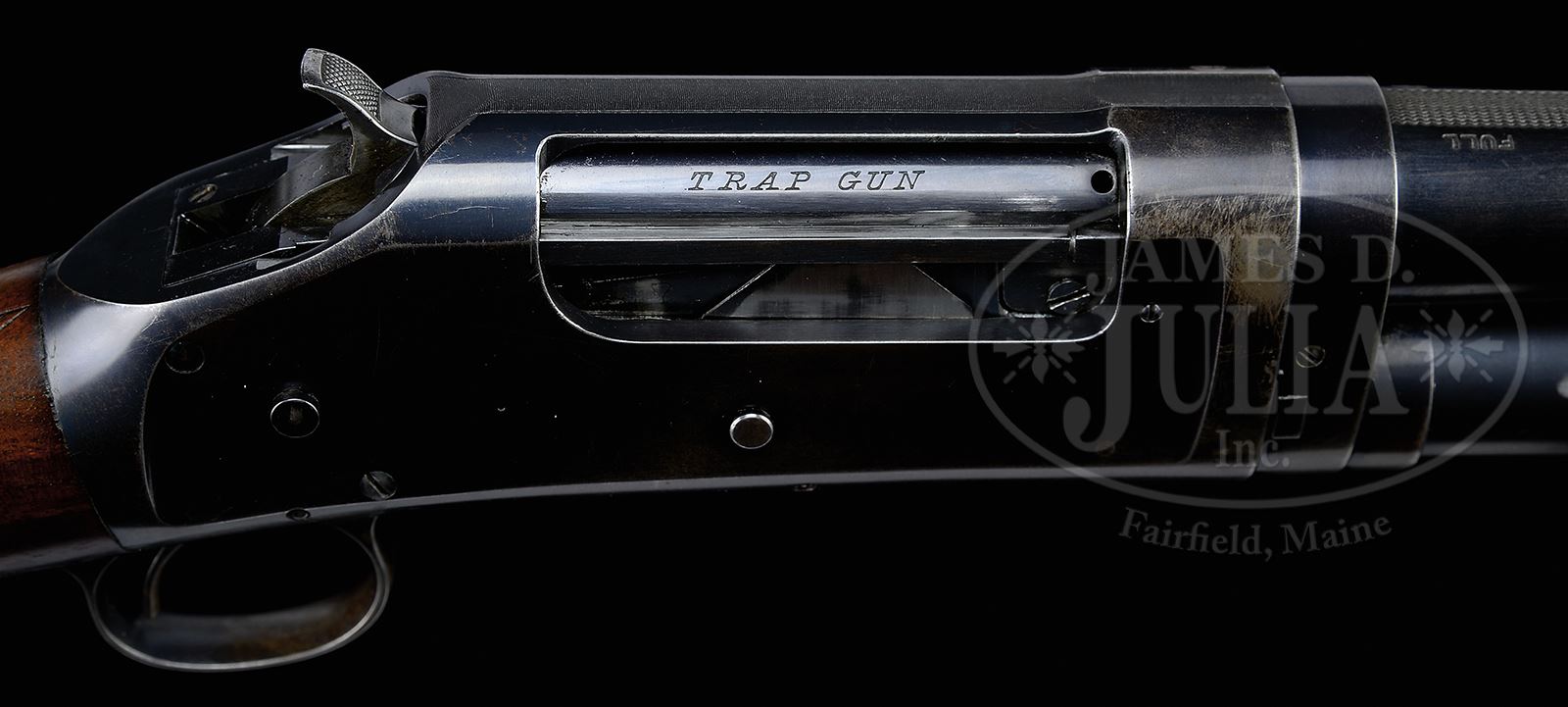 SN 474736. (ca 1910) Cal. 12 ga. 30″ Bbl with matted top is stamped “FULL” on one side of matting, and has Winchester information on left. Typical blued action is matted on top. Bolt is engraved “TRAP GUN”. Lightly fiddle figured American walnut straight grip buttstock measures 13-7/8″ over deeply curved orig Winchester buttplate. Point pattern checkering with beaded borders is at grip, which also has inlaid ebony diamonds. Matching small round checkered forend is nicely streaked. Bore diameter: .730. Bore restrictions: .031 (full). Drop at heel: 2-1/8″, drop at comb: 1-3/4″. Weight: 7 lbs 14 oz. LOP: 13-7/8”. CONDITION: Very fine. Bbl assembly retains approx 90% orig blue, with silvering on high points, magazine tube, and slide. Action retains over 70% of its blue, thinning on bottom and left side, silvered on front right, and on trigger guard bow. Stocks retain nearly all of their orig finish with some light marks, checkering lightly worn. Bore is excellent with some light frosting. Action is smooth. A nice usable example of this classic Winchester. 49224-7 MGM62 (2,200-2,500) – Lot 2428