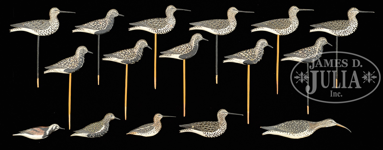 PLEASE NOTE: Title should be SIXTEEN SILHOUETTE CARVED WOOD AND PAINTED SHOREBIRD DECOYS by ELMER CROWELL. These were not cataloged until late (just before catalog production) by a non-decoy specialist. When Mr. Julia returned to the office he saw them and immediately recognized them as silhouettes produced by Elmer Crowell. The entire collection came from one house and were originally cataloged to be sold as an entire lot and this is the way they will be sold. This will certainly be an interesting lot. Please see detailed photographs on our website showing both front & back of each of the silhouettes. Please note that most of them have their original carrying holes and many with their old & probably original sticks. SIXTEEN SILHOUETTE CARVED WOOD AND PAINTED SHOREBIRD DECOYS.All decoys but one have brown and white paint with spotted bodies. Six are 12″ long and have long, thin beaks. Six are 9-1/2″ long with short beaks. One 16-1/2″ long elongated with slightly curving beak . One is 9-1/2″ long with short beak. One is 10″ long with long beak. One is 9-1/2″ long with a different colored body. All are carved with split tails and realistic paint and tack eyes. Eleven sticks are present. Unsigned. SIZE: As noted above. PROVENANCE: Through the Family of George Newton Procto III of Marblehead, Massachusetts. CONDITION: Each have a hole drilled through shoulder with some loss through chipping, minor paint flecks. Generally very good. 50574-7 (1,000-1,500) – Lot 2428