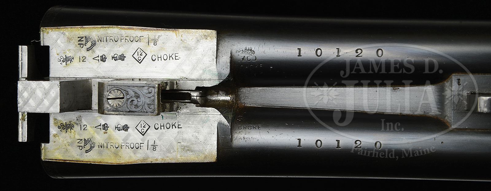 *FINE, AS FOUND, WILLIAM EVANS SIDELOCK EJECTOR GAME GUN WITH CASE.SN 10120. (Ca 1911)Cal. 12 ga. 2-1/2″ Chambers. 30″ Dovetailed steel bbls are engraved “William Evans (From Purdey’s) 63 Pall Mall. St. James’s, London.” on low, concave game rib. Bbl flats are damascened and stamped with London nitro proofs for 1-1/8 oz of shot. Bottoms of bbls are stamped with SN. Case hardened sidelock action is stocked to the fences and features automatic safety (SAFE inlaid in gold), double triggers, bushed strikers, and screw grip dolls head third fastener. Action and lockplates are engraved with bold, large, open, shaded scroll with acanthus highlights, and an attractive floral and scroll device on lockplates. Action beads are well filed and fences engraved with large shaded scroll somewhat deeper in relief than that on action. Scroll engraved steel trigger guard has relief SN on short tang. Well figured and lightly streaked, dark European walnut straight grip buttstock measures 14-3/8″ over checkered wood butt, and features drop points, diamond hand, classic point pattern checkering with mullered borders, and a vacant silver oval on toe line. Matching splinter ejector forend has Anson release. Bore diameter: left-.731, right -.730. Bore restrictions: left -.019 (Mod), right -.011 (IC). Wall thickness: left -.033, right -.032. Drop at heel: 2-1/8″, drop at comb: 1-7/16″. Weight: 6 lbs. 12 oz. LOP: 14-3/8″. Maker’s leather case with brass corners is embossed “L. C. C.” and “JUNR” on lid, which also has remnants of numerous shipping labels. Interior is lined in scarlet cloth having gold embossed black Evans label on lid. CONDITION: Excellent, as found, retaining an exceptional amount of what appears to be its orig finish on wood and metal under more than a half century’s accumulation of wiped on oil and dust. Bbl blue appears to be smooth, with only a few rubs through. Case colors appear to be vivid, with silvering only on action beads and fences. Oil finish of stock shows slightly raised grain and a number of minor nicks and dents. Checkering is slightly worn and dirty. Bores are bright and shiny with a hint of frosting. Action is tight. Bbls are on face. Ejectors are slightly out of time. Case leather is dark, crazed, and with considerable amount of top grain lifted. Handle, straps, and retainers are missing. Interior cloth shows considerable insect damage, some mildew. Partitions are tight. Label is excellent. A solid, good handling gun in need of a judicious cleaning. 4-49583 (8,000-12,000) – Lot 2429
