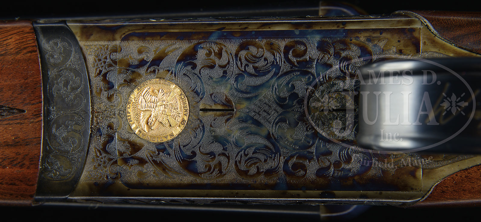*AS NEW CONNECTICUT SHOTGUN RBL NRA SPECIAL WITH CASE AND ACCESSORIES.SN RBL#NRA00012. Cal 20 ga. 28″ bbl. 2-3/4″ chambers with full length top rib and brass front bead. Gold plated sgl selective trigger, auto ejectors, auto safety. Straight grip buttstock with long tang checkered in two-point pattern with 14-3/4″ LOP over lined HRBP. Beavertail forearm checkered in two-point pattern with Curtis type push button release. Case hardened receiver is near fully scroll engraved with special gold NRA emblem on bottom of frame and facsimile gold colored “Wayne LaPierre” signature on rolled trigger guard bow. Housed in its orig canvas case with accessories including five choke tubes, shooting glasses, snap caps, etc and orig order label. Weight: 6 lbs. 10 oz. CONDITION: As new. Purchased new by our consignor and never fired. Case is equally new with just a couple of minor handling marks. Also included is the exterior “RBL” shipping box which is very good. 51406-12 JSL (3,000-4,500) – Lot 2429
