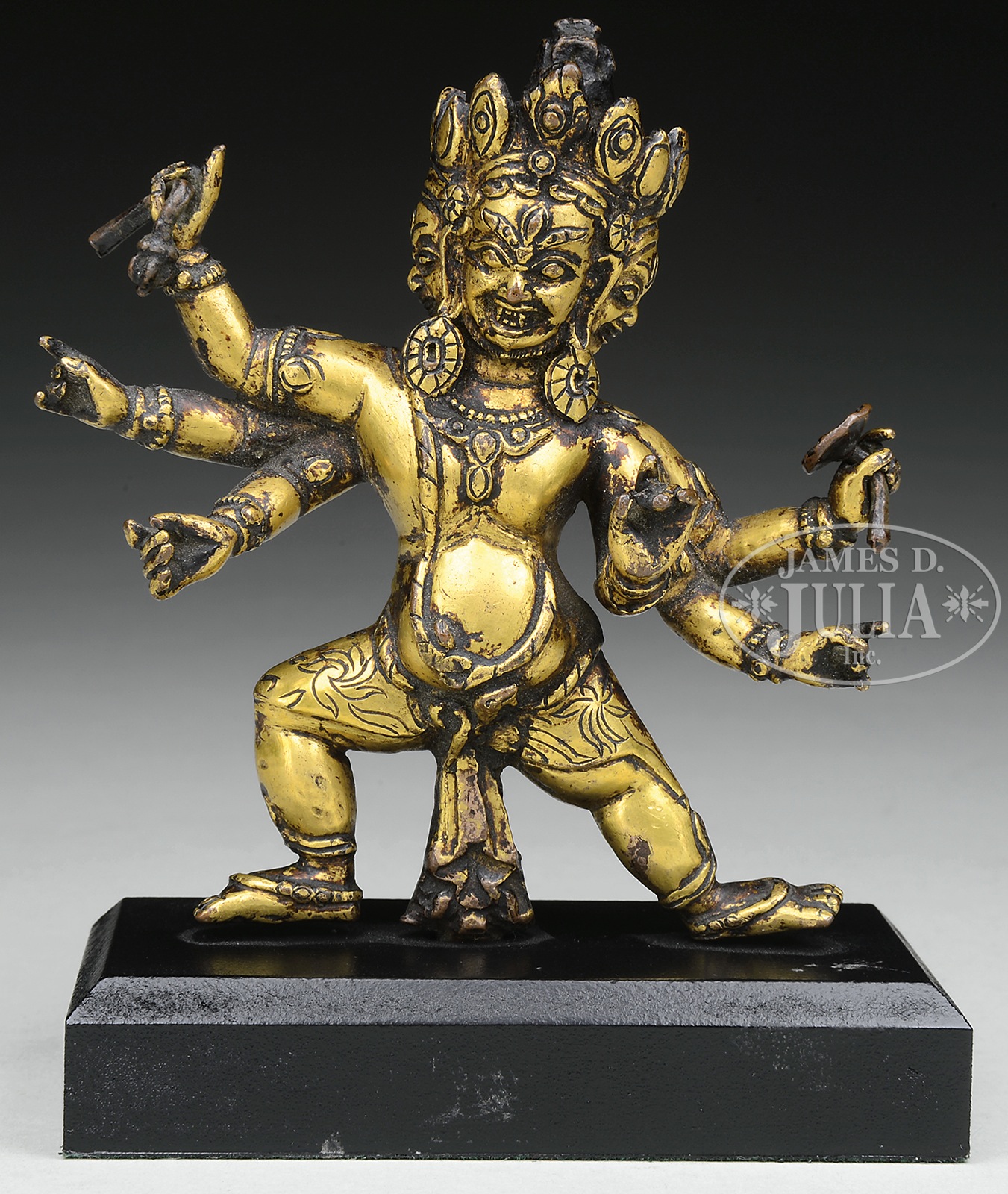 SMALL GILT BRONZE FIGURE OF A WRATHFUL PROTECTOR.Previously sold at Christie’s New York, Sept. 2004, Sale No. 1409, lot 133 described as: Tibet, 14th Century. The three-headed deity trampling in alidhasana with his six arms radiating around him, wearing a tiger skin dhoti and a snake garland, his faces with ferocious expressions and foliate tiara, richly gilt overall. 4 in. (10 cm.) high. SIZE: 4″ x 4″. PROVENANCE: Christie’s sale 1409, Lot 133. CONDITION: Minor surface rubbing, otherwise very good. One or more elements in hand missing. 9-95167 (2,500-3,500) – Lot 243