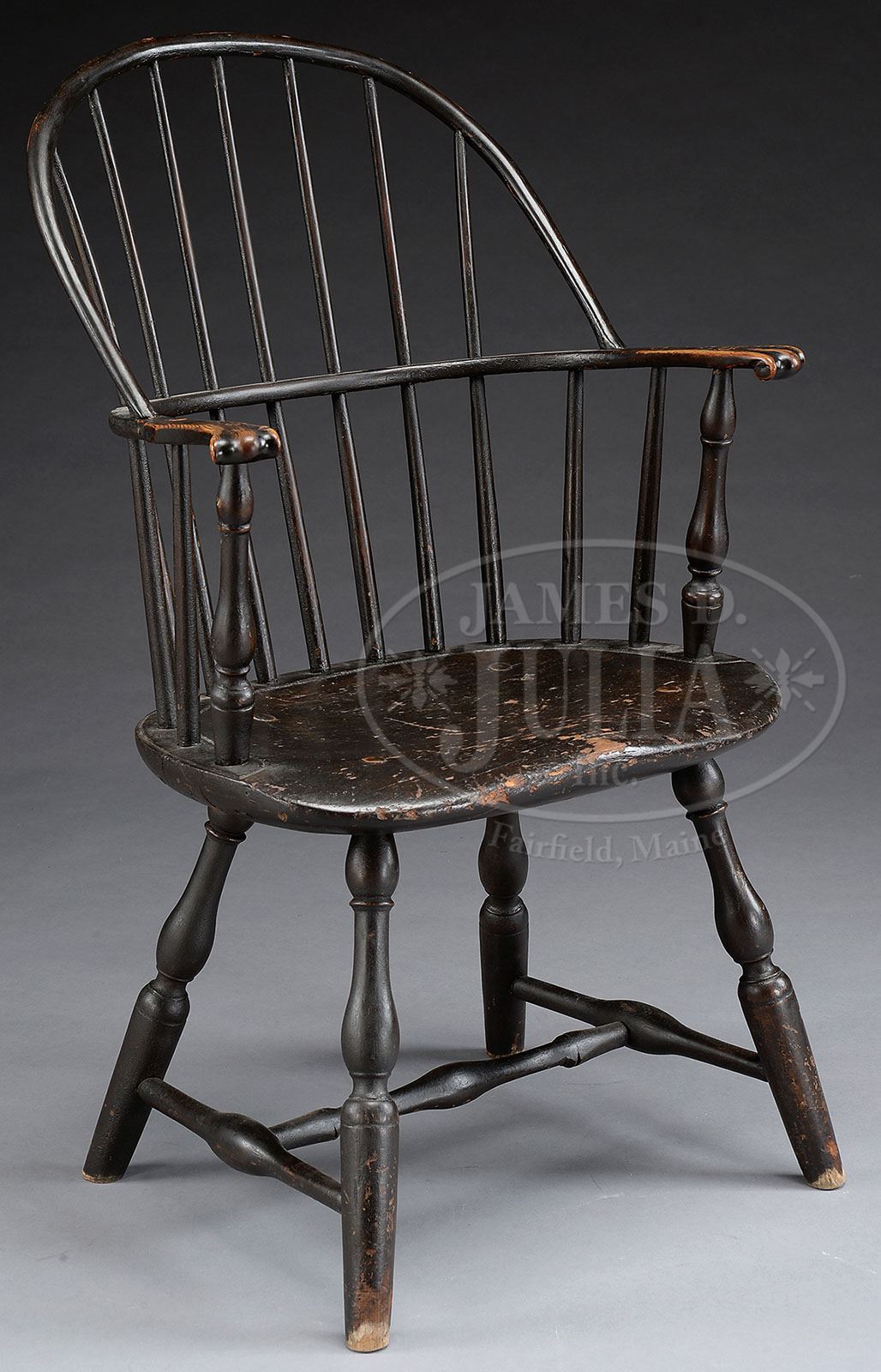 FINE SACK-BACK KNUCKLE ARM WINDSOR CHAIR. Circa 1770, Connecticut. The armchair comprised of pine, maple, hickory and ash, of well developed form with arched round crest raked rail terminating in square ends (typical of North Central Connecticut) above seven spindles joined to the medial arm rail continuing to carved knuckle hand holds on vase, ring and reel-turned supports centering a wide saddle seat. The well splayed legs with vase, ring and reel turnings joined by bulbous H-form stretcher. SIZE: 37″ h. Seat: 17″ h. CONDITION: Chair retains early brown/black paint, now dry and crusty. The underside of seat with early plug repairs stabilizing split. Very good overall, with expected wear and abrasions. 9-91573 (1,000-2,000)