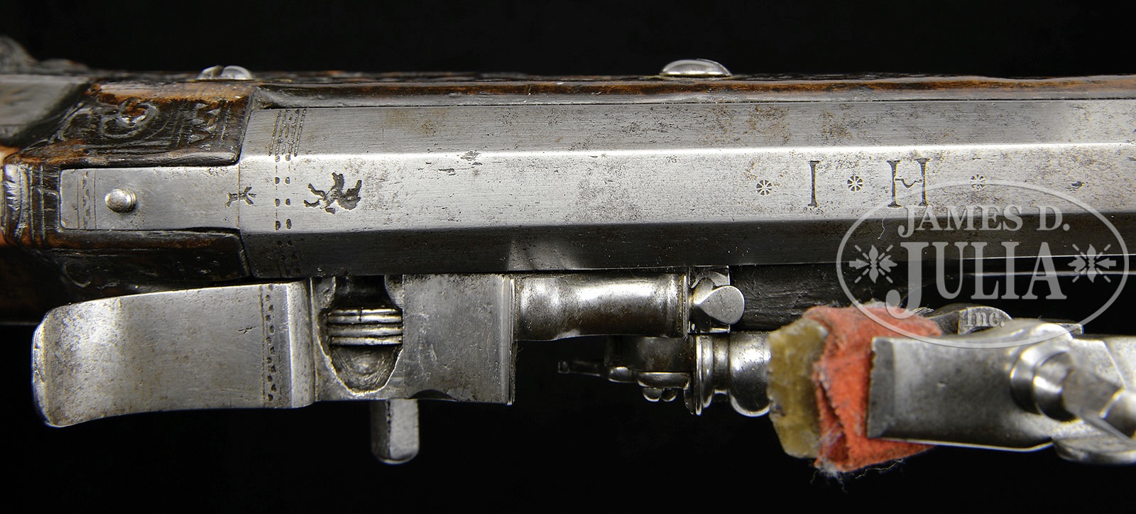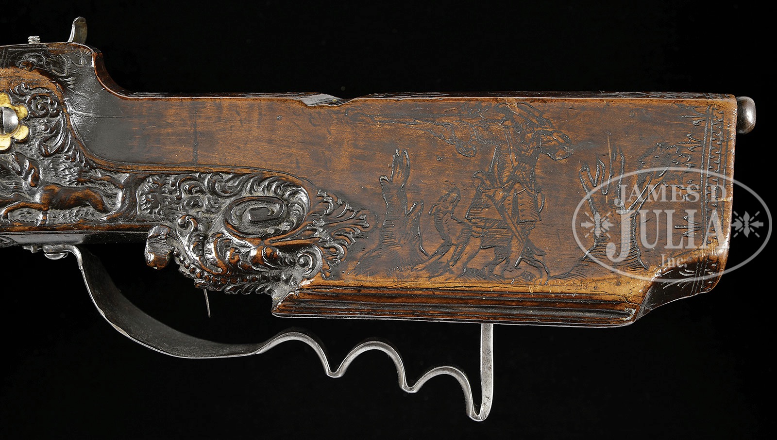 GOOD GERMAN WHEEL LOCK RIFLE, CARVED IN THE MANNER OF JOHANN MICHAEL MAUCHER OF SCHWABISCH GMUND, CIRCA 1650.SN NSN. This most interesting carved wheel lock actually bears the initials of the famed Michael Maucher on the stock behind the tang. Whether these are the initials of the master himself or carved at a later date cannot be determined. Regardless, the carving is of a very high order and good quality throughout. The lock is extremely plain with internal wheel and cover pierced with two circles and an arrow. The finely formed hammer is finely engraved, possibly missing part of the top jaw. Bbl is octagonal and bears maker’s initials “IH” and stamped mark of a unicorn rampant at breech. Stock carved with monster face under lock. Stag and dog on side cheek piece inside carved with hunter firing a wheel lock. Forend nicely fluted. Patchbox carved in high relief with an armored solder, possibly St. George slaying the dragon. Plain horn forend cap and ramrod pipe, likely replaced. Any gun by or attributed to Michael Maucher is a rare and desirable work of art and this piece is no exception. PROVENANCE: Collection of Dr. Douglas Sirkin. CONDITION: Lock clean and bright. Bbl clean and bright, stained but with no pitting. Stock has magnificent centuries old honey colored patination with carving somewhat worn but most attractive. 4-50072 (15,000-30,000) – Lot 2431