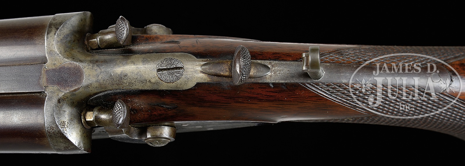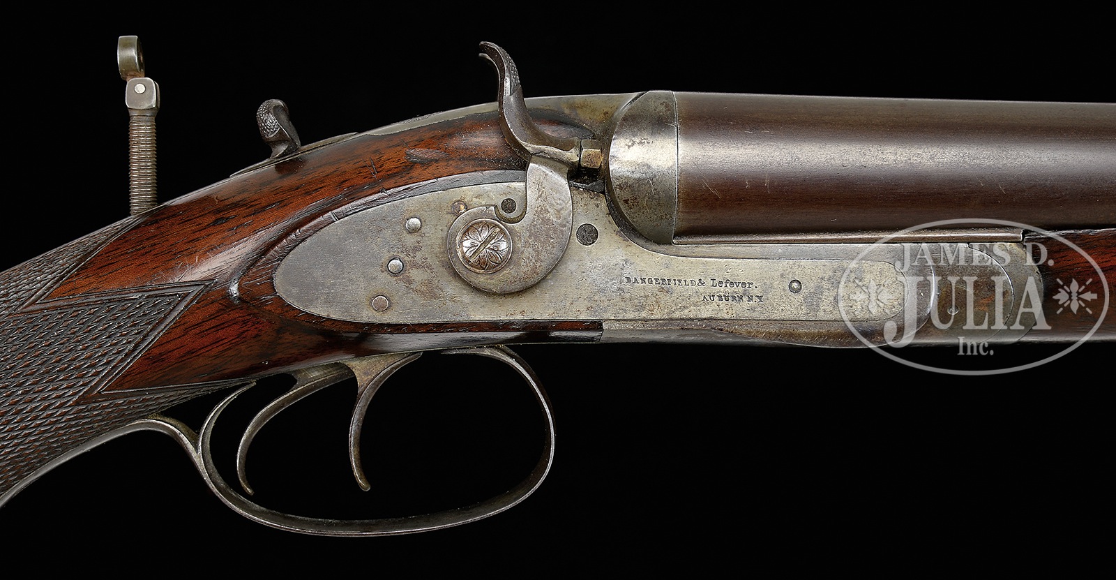 EXCEEDINGLY RARE CAPE GUN BY DANGERFIELD & LEFEVER.SN 32. (ca 1872) Cal. 14 ga. x 40/50 Sharps Bottleneck. 28-1/4″ Steel bbls are marked “Dangerfield & Lefever” and “AUBURN N.Y.” on full length flat rib with dolls head extension. Rib is fitted with single standing U-notch leaf rear sight, and large white bead front. Front portion of lump is stamped “No 32” and with a large “3”. Case hardened action with push forward knurled button to withdraw top locking bolt which engages dolls head (a Lefever feature until the end of production), is fitted with non-rebounding bar locks with plain high spurred flat sided hammers. “Dangerfield & Lefever Auburn N Y” is at the front of each lockplate. Water table is stamped “No 32”. Top strap is fitted with lollipop type screw adjustable sight with flip-up aperture. Dense American walnut pistol grip buttstock measures 14″ over steel buttplate with 1″ top spur. Well cut, coarsely spaced checkering is at grip. Bottom of grip is carved in very fine shell motif. Matching splinter uncheckered forend with nicely schnabel-filed inset horn tip, attaches to bbl with captive side nail through oval steel escutcheons, and is marked “No 32″ on iron. Bore diameter: left -.717. Bore restrictions: left – .000 (cyl). Wall thickness: left – .038. Drop at heel: approx 2-5/8″, drop at comb: approx 1-15/16″. Weight: 10 lbs. 5 oz. LOP: 14”. CONDITION: Fine. Bbls retain 80 – 85% of their orig brown with scattered flecking and some marks and light scrapes. Front sight bead is new. Action and lockplates retain a considerable amount of their orig case hardening color, which was never very dark, and has some scattered mottling and staining. Stocks retain nearly all of their orig finish with slightly raised grain and a number of light scratches with a fairly deep ding on right side of butt. Finish on forend is worn relatively thin. Bores are excellent. Shotgun bore has some scattered minor light pits. Locks are crisp. An exceptional example from the earliest days of the illustrious career of D. M. Lefever, in a very unusual configuration. Easily the finest Dangerfield and Lefever Cape gun known. 50131-2 MGM180 (12,500-17,500) – Lot 2431
