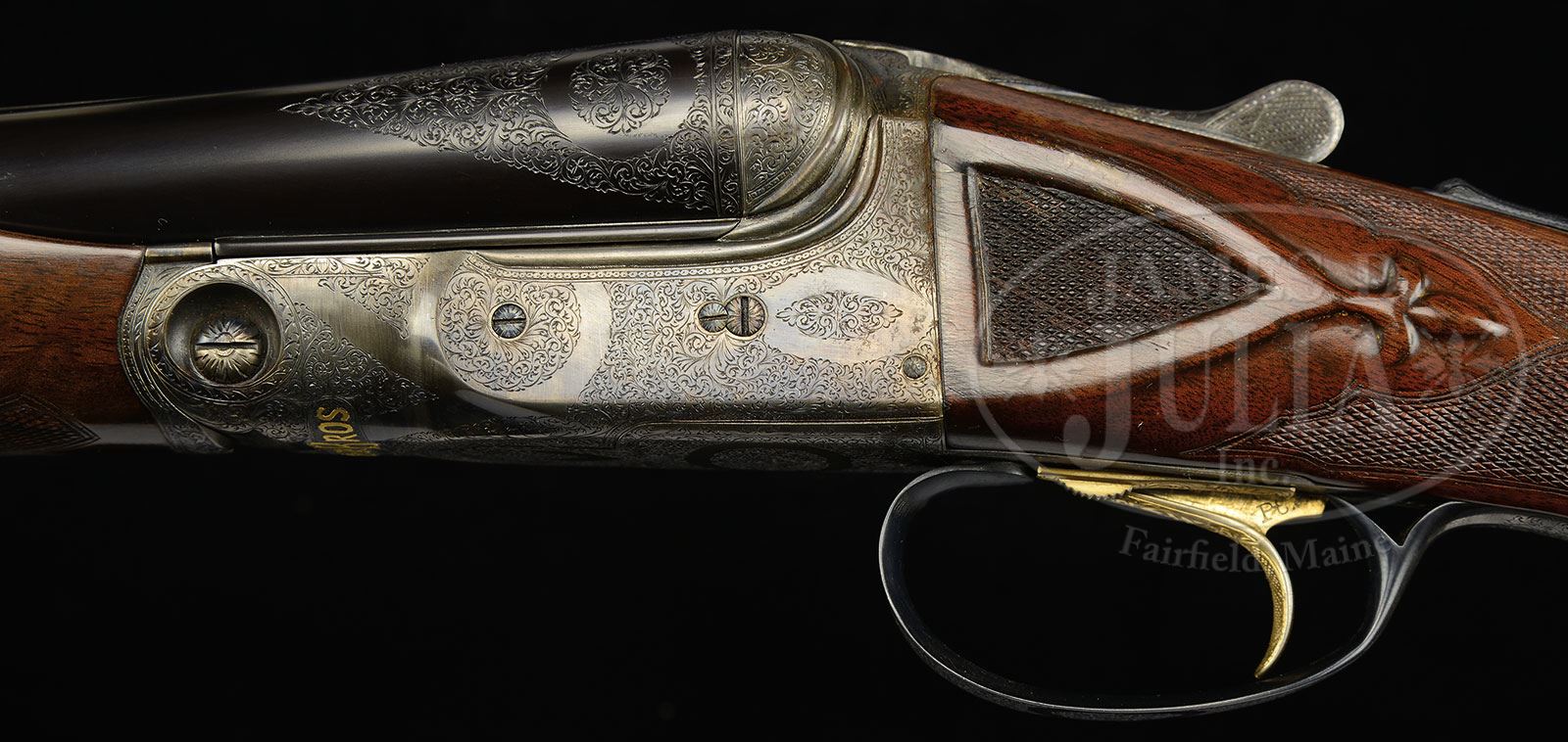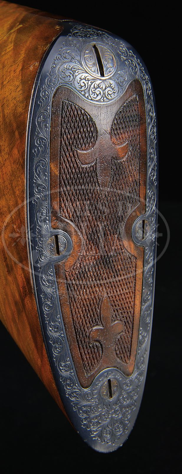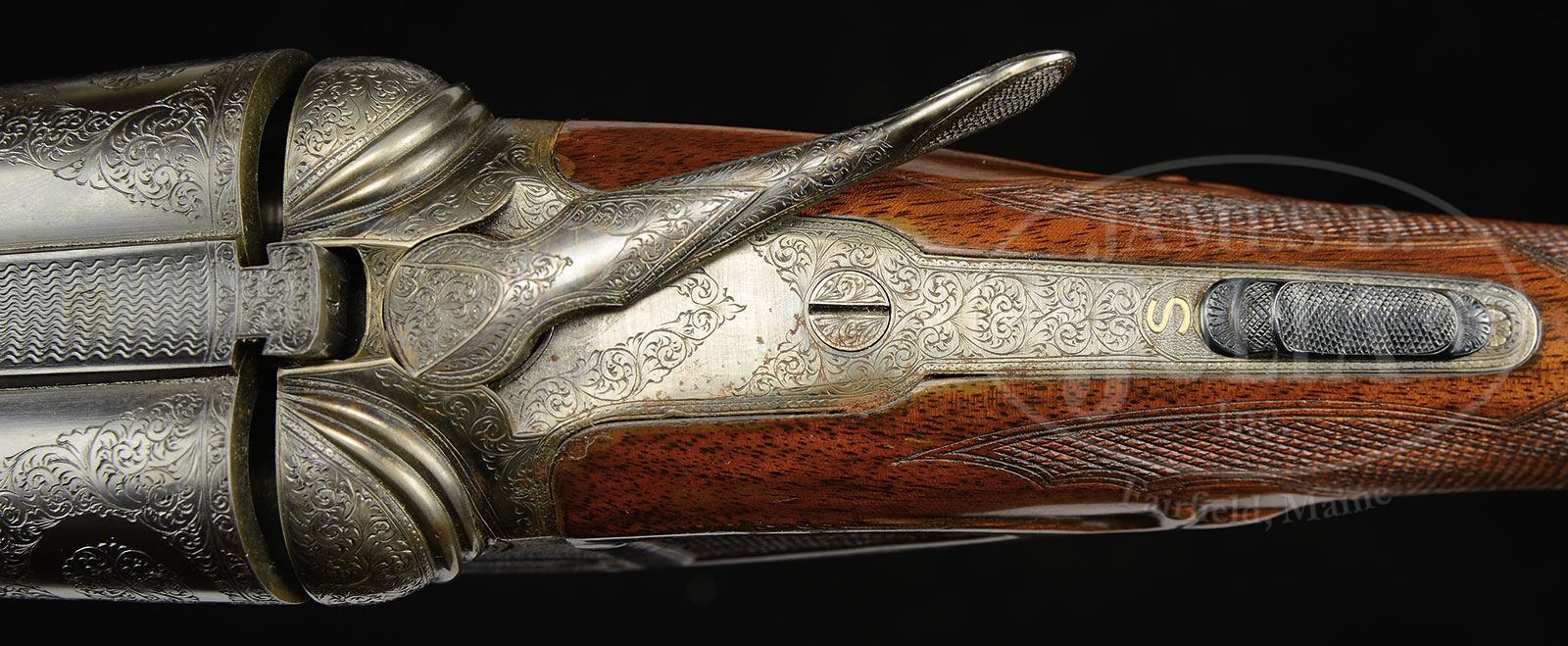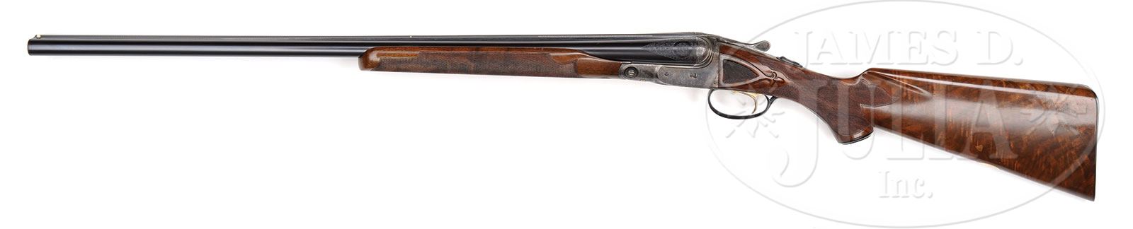 *16 GAUGE PARKER AAHE UPGRADE.SN 239404. Cal. 16 ga. 2-1/2″ Chambers. 1 Frame. 28″ Bbls are marked with Parker address and “Peerless Steel” on rib, and have Peerless Steel logo on flats. There are 2-1/2″ triangles of scroll at breech ends. Parker Gun Identification & Serialization ledger lists this gun as originally a 12 ga. VHE with capped pistol grip and single trigger. Action has “AAH” markings on water table, and has been filed with three beads behind fences, and chevron on top lever. Action is engraved with 80% coverage small scroll. “Parker Bros” is inlaid in gold on bottom. Trigger has been gold-plated, and SN is in relief inlaid gold on scroll engraved trigger guard tang. Nicely figured American walnut capped pistol grip buttstock measures 14-1/8″ over skeleton steel buttplate, and is checkered and carved in “AA” style. A vacant gold oval is on toe line. Matching beavertail forend has reinforcing bolt. Bore diameter: left -.664, right -.664. Bore restrictions: left -.022 (Full). right -.014 (Mod). Wall thickness: left -.024, right -.022. Drop at heel: 2-3/16″, drop at comb: 1-7/16″. Weight: 7 lbs 4 oz. LOP: 14-1/8″. CONDITION: Excellent, as custom finished, retaining essentially all of its wood and metal finishes with only a few light handling marks, some lifting of varnish on buttstock, and some light rust and moisture damage along left rear of action. Bores are excellent. Action is tight. Ejectors are in time. Trigger works. 4-51343 MGM11 (12,500-17,500) – Lot 2432
