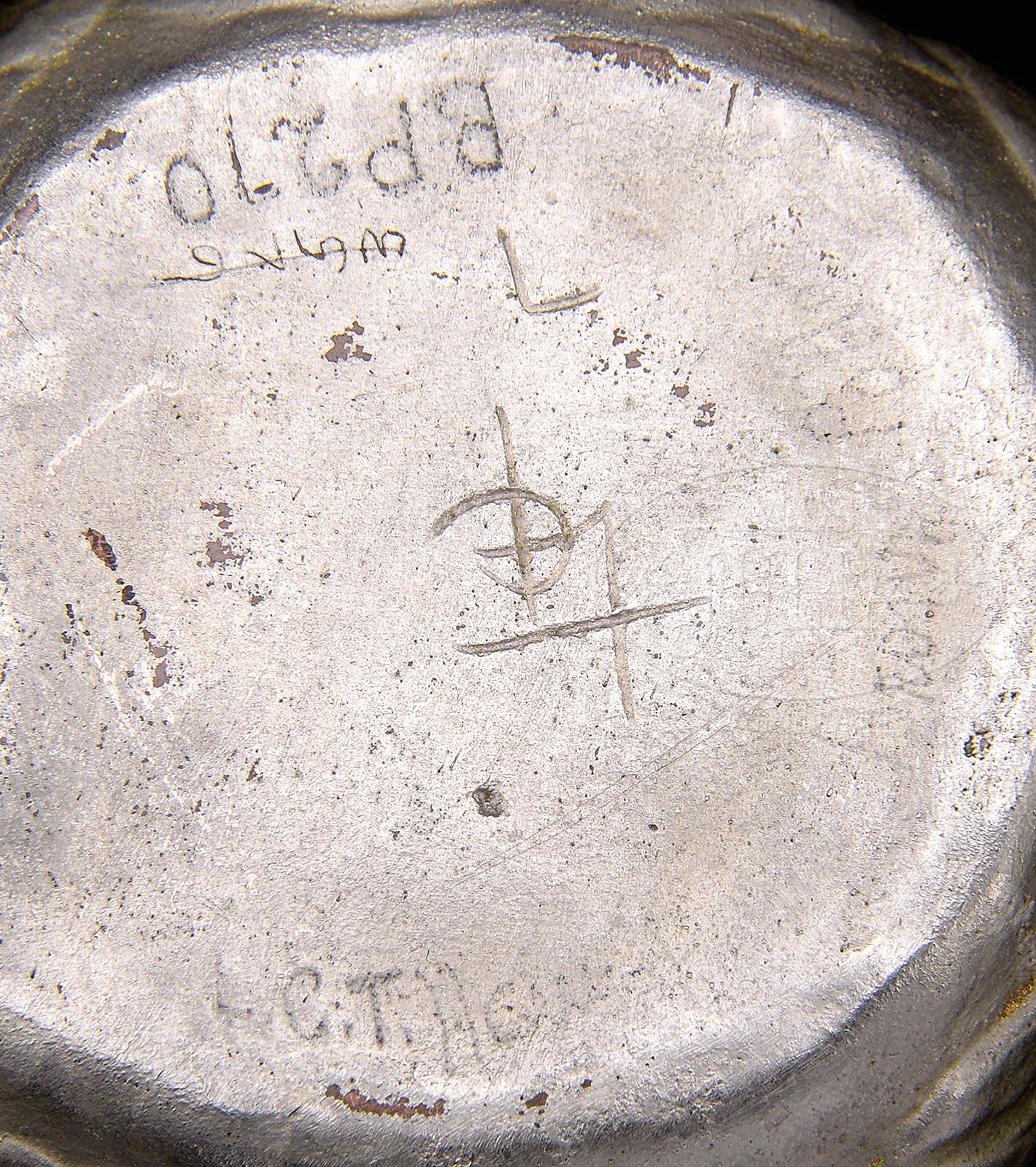 TIFFANY BRONZE POTTERY VASE.Tiffany pottery vase is decorated on four corners with a sicada having wings spread. Vase has a silver colored finish as well as green glazed interior and is etched on the underside with conjoined initials “LCT” and is also marked “L.C. Tiffany – Favrile Bronze Pottery BP 270”. SIZE: 2-1/4″ t x 2-3/4″ w. PROVENANCE: From the Unreserved Collection of Dr. & Mrs. Brian Bojesen. CONDITION: Very good to excellent with some minor wear to finish. 50361-68 (1,000-1,500) – Lot 2433