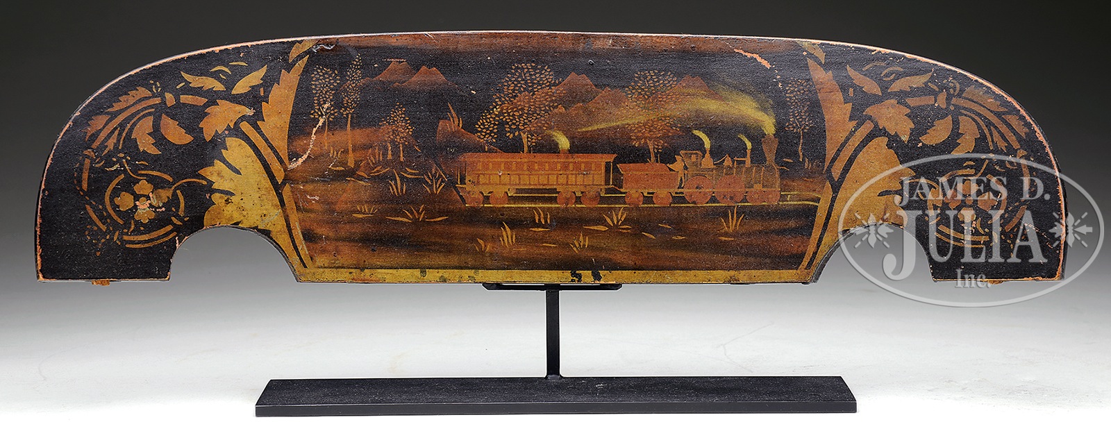 WONDERFUL STENCIL AND PAINT DECORATED CHAIR CREST.1st half of the 19th century. Shaped crest having central train motif through mountain landscape with stenciled leaf scrolling accents. Accompanied by a custom metal display stand. SIZE: 6″ h x 23″ l. CONDITION: 2 scratches and edge wear. 49933-1 (600-800) – Lot 2434