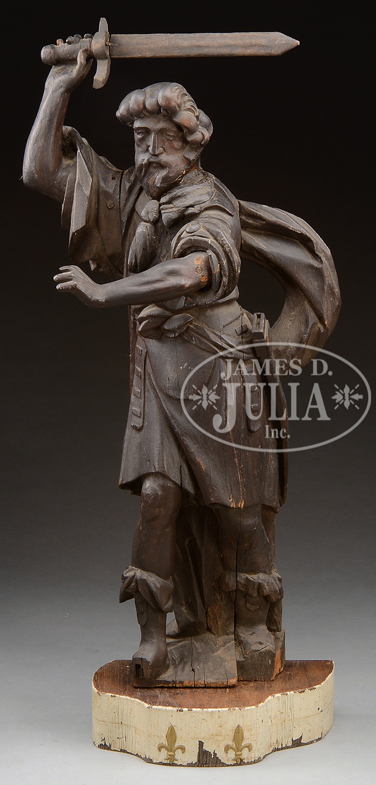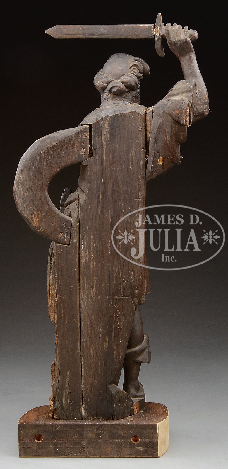 19TH CENTURY EUROPEAN HALF LIFE SIZE CARVING OF A MAN WITH SWORD DRAWN.The 19th Century carving shows a standing man with arm over his head holding a sword which he has pulled out of a sheath at his side. Appears to be carved of oak and probably stood flat against a surface high in the air. Possibly an architectural element in an interior library or foyer. Presently mounted to a slab wood base with fleur de lis decoration. SIZE: 55″ h overall x 24″ at widest. CONDITION: Cracks & chips with seam separation, some old repairs & losses. Otherwise good. 50932-1 (1,500-2,500) – Lot 2435