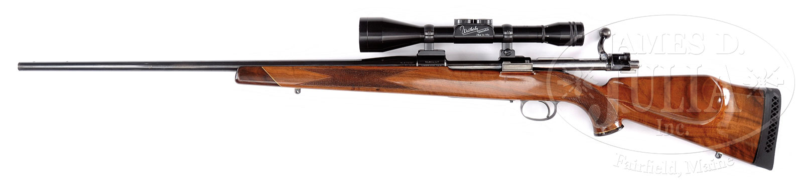 *WEATHERBY SOUTHGATE FN 98 BOLT ACTION RIFLE.SN 3552. Cal. 270 Weatherby Mag. Very early Weatherby produced in Southgate, CA, possibly 1955 first year mfg. 24″ light sporter weight bbl with chrome bore. Weatherby variable 2-3/4x to 10x gloss finished scope with standard crosshair on Redfield mounts. Monte Carlo cheekpiece California Style stock of fancy walnut. Stock features include rosewood forearm tip and grip cap with white line spacers, hand checkering and swivel bases. LOP: 13-5/8″ over after market Pachmayr black ventilated pad. CONDITION: Orig high gloss blue shows spots of fading on bbl with edge wear on action. Good bright bore. Good orig stock finish showing scattered scratches and marks. 51590-2 (1,000-2,000) C&R – Lot 2435 Click here to view provenance