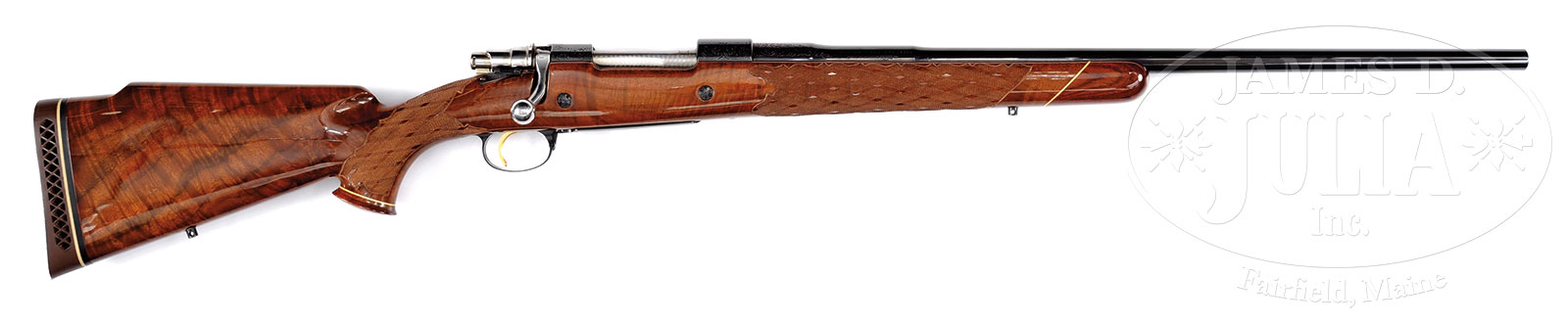 *GORGEOUS NEAR MINT BROWNING MEDALLION GRADE RIFLE IN 338 WIN MAG.SN 7X 42782. Cal. 338 Win Mag. 25″ blued steel bbl. Lightly floral and scroll engraved in Medallion pattern. Trigger guard and trigger plate nicely engraved with gold line inlay. Gorgeous American Walnut flame grained buttstock with cheekpiece checkered in skip line pattern through wrist and forearm. Rosewood nosecap and grip cap. Gold plated trigger. Matching numbered bolt. Weight: 8 lbs. 2 oz. PROVENANCE: The William Hammond Collection. CONDITION: Extremely fine and near mint. Likely test fired only. Retaining nearly all orig finish to both wood and metal. There is a minute amount of finish loss behind bolt but overall excellent to near mint, with just the faintest of handling marks. Mechanics are crisp. Brilliant shiny bore. 51407-14 JSL (2,000-3,000) – Lot 2436
