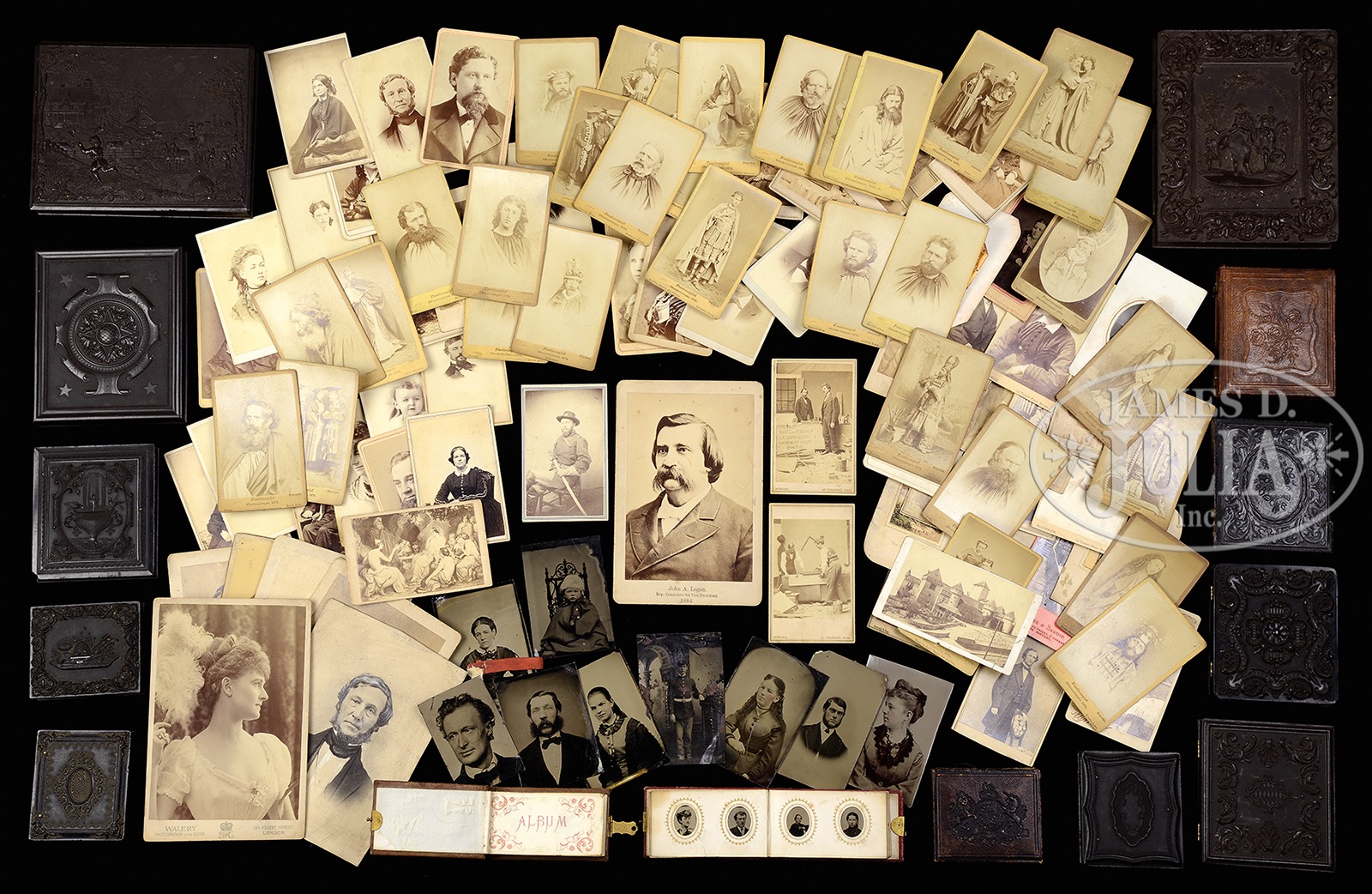 Please Note: There are no full plates in this lot. There are 14 daguerreotypes and ambrotypes: two half plates, one quarter plate, six sixth plates and five ninth plates. LARGE LOT OF OVER ONE HUNDRED 19TH CENTURY PHOTOGRAPHS.This grouping appears to have originated in New England with many New England back-marks on CDVs and cabinet cards. Grouping has 12 daguerreotypes and ambrotypes. Nine of these images are in decorated gutta percha cases, including two rare full plates, one half plate, three quarter plates and three sixth plates. There are two small albums of photographic gem tintypes, over thirty gems in those two albums. There is a series of thirty-one 1870-71 dated CDVs of actors of the Passion Play (Passionssiel, Oberammergau). Other CDVs are mostly portraiture with a few Civil War soldiers. There are four cabinet cards of Vice Presidential candidates John Logan and Thomas Hendricks, 1884. PROVENANCE: Maralyn Young estate, Arundel/Falmouth Maine, being sold unreserved. CONDITION: Good to fine, interested parties should inspect. Hard rubber cases are mostly very good, though one full plate is discolored, soiled, chipped and the emulsion of the two soldiers on ambrotype is highly flaked and quite poor. 51412-86 (400-800) – Lot 2437